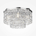 Kristalle verschiedener Formen hängen in einem dichten Schleier von dem profilierten Sockel und erfüllen den Innenraum mit einer Atmosphäre von Luxus. Die Leuchte ist aus verchromtem Metall gefertigt, das das Licht der Lampen reflektiert.