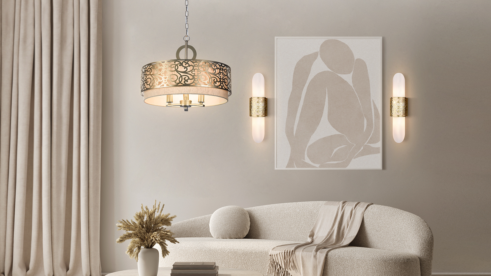 Die Konturlinie des durchbrochenen Musters steht im Kontrast zum hellen Lampenschirm. Dieser Effekt wird beim Einschalten des Lichts noch verstärkt. Gestell und dekorative Ringe sind aus Metall gefertigt und in Messingfarben lackiert. Der Lampenschirm besteht aus Baumwolle auf PVC-Basis. Das Innenleben der Deckenleuchten ist durch einen Diffusor aus dem gleichen Material wie der Lampenschirm geschützt. Die Pendelleuchten sind in der Höhe über die Länge der Kette verstellbar..
