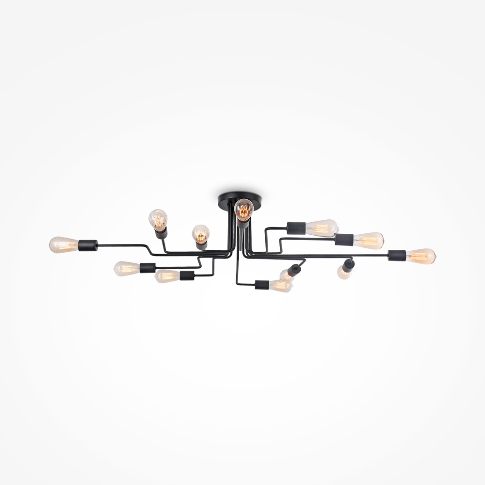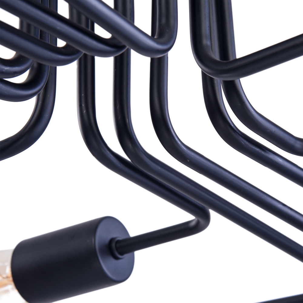 Die gesamte Konstruktion ist in mattem Schwarz gehalten, was den expressiven Charakter der Leuchten unterstreicht.