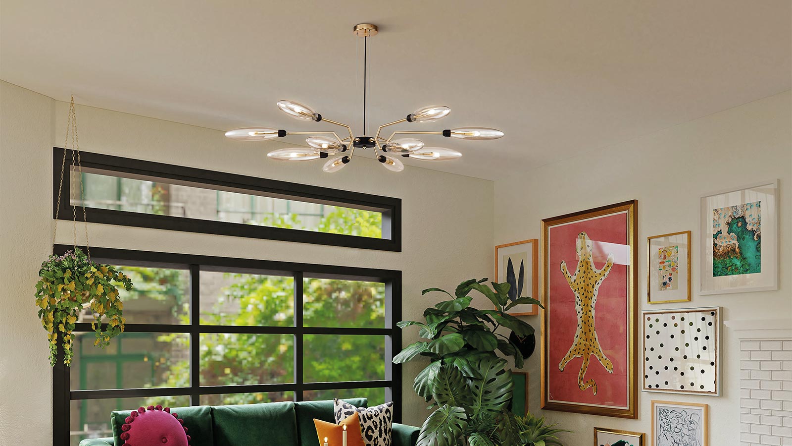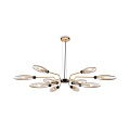 Metallbeschläge in mattem Gold. Die einzelnen Elemente sind schwarz lackiert. Lampenschirme aus Glas in Bernstein. Lampenschirme mit einer eigenartigen langgestreckten Form. Einstellbare Höhe der Pendelleuchte.