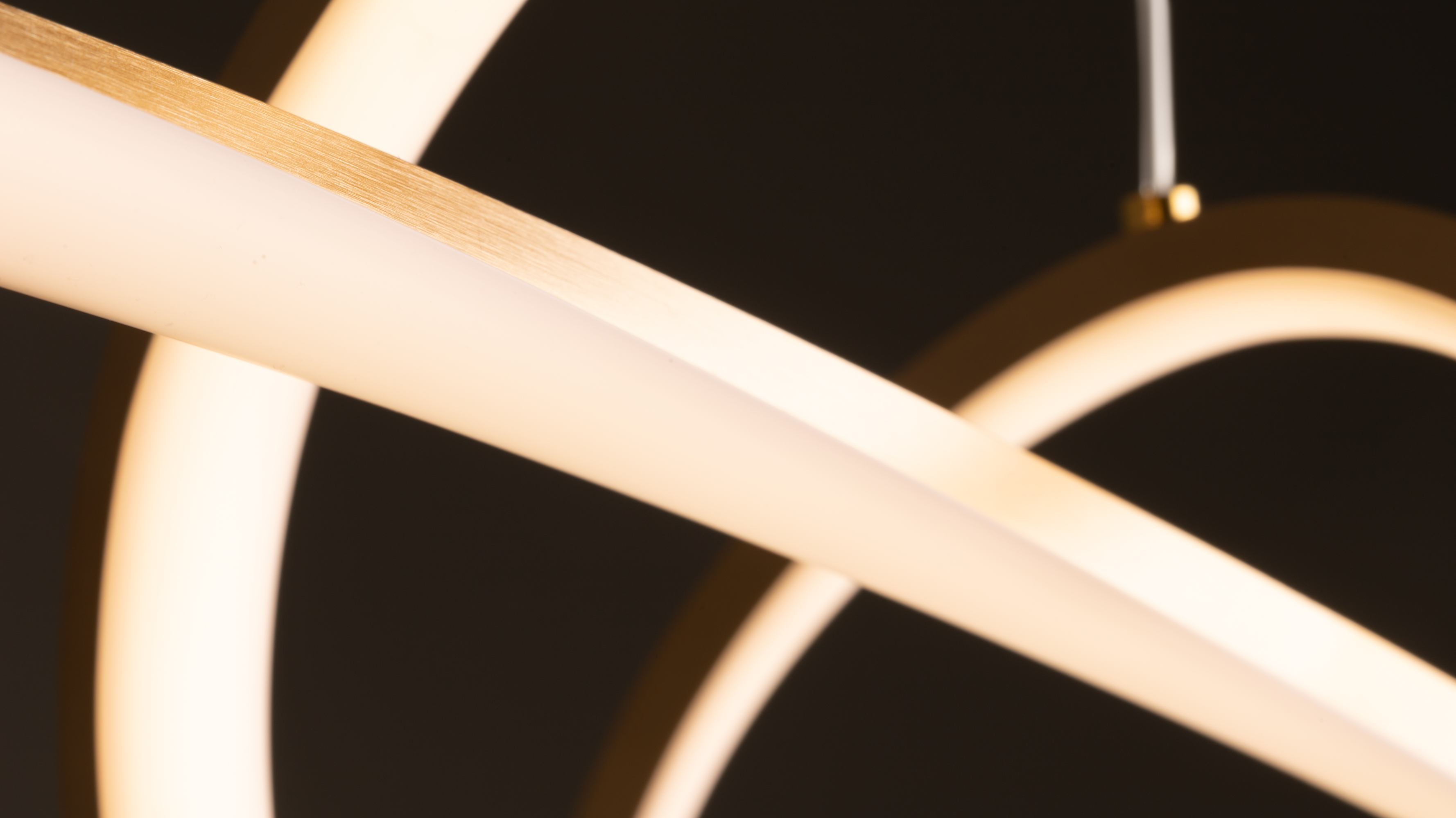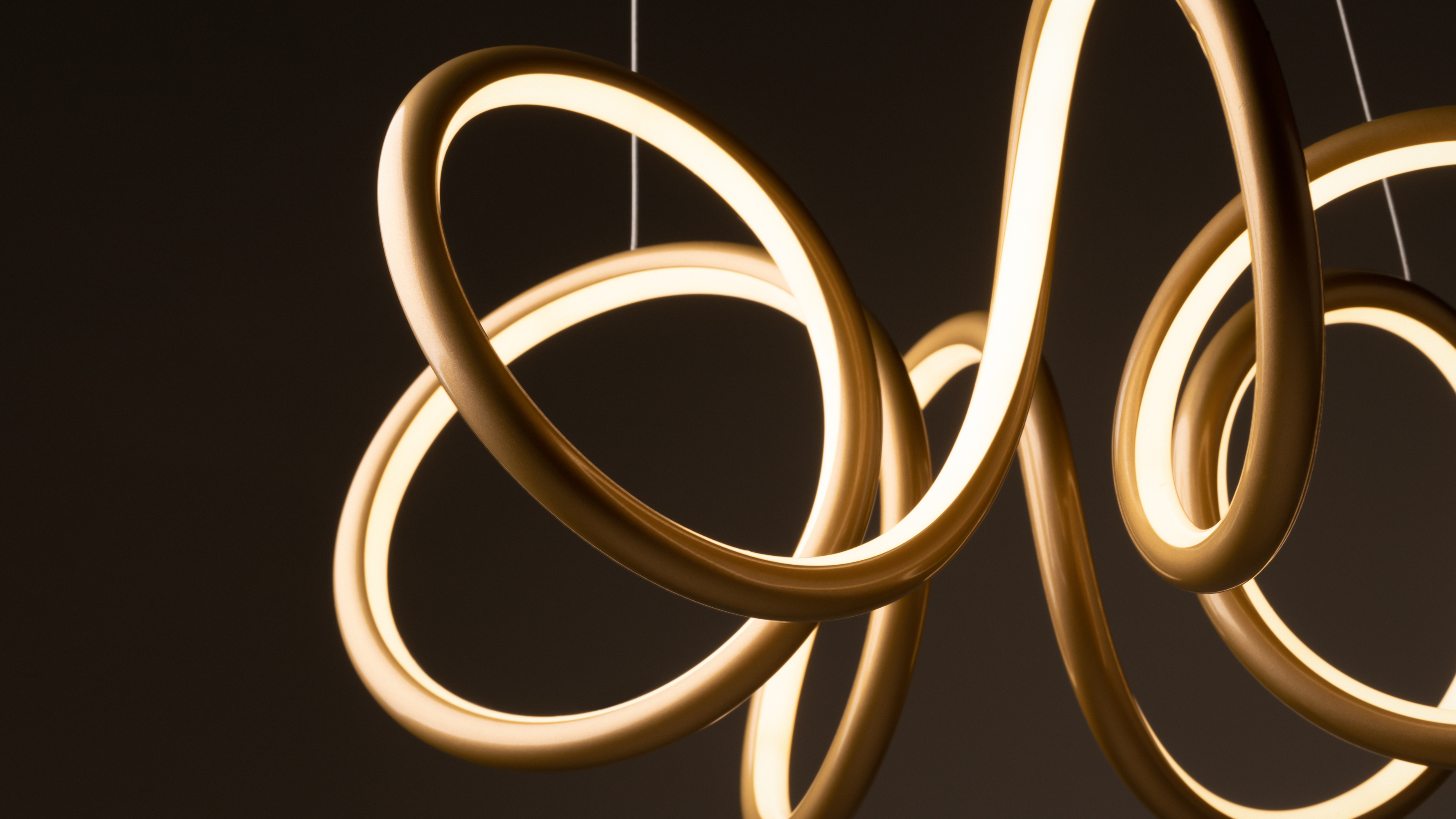 Metallbeschläge, Farben - Schwarz, Messing. Abgerundete Silikon-Leuchtelemente mit rundum integrierter LED-Lichtquelle. Einstellbarer Farbtemperaturbereich 2600K-3500K für Leuchten in Messing und 3000K-4000K in Schwarz. Einstellbare Länge von Kabelhalterungen. Phantasiegestalt von chaotischen, frei im Raum schwebenden Fragmenten von Spriralen.