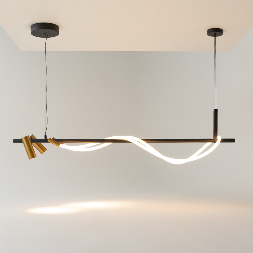 Die Leuchten der Serie Tau entsprechen dem aktuellen Trend, flexibles Neon als Diffusor zu verwenden. Diese Serie umfasst Pendel-, Decken-, Wand- und Stehleuchten mit einem Diffusor aus flexiblem Silikon-Neon und einem Neon-Kabelhalterung mit einer hohen LED-Dichte. Sie erzeugen ein weiches und diffuses Licht und passen dank des Hightech-Designs der schwarzen und messingfarbenen Beschläge ideal in moderne, minimalistische Innenräume.