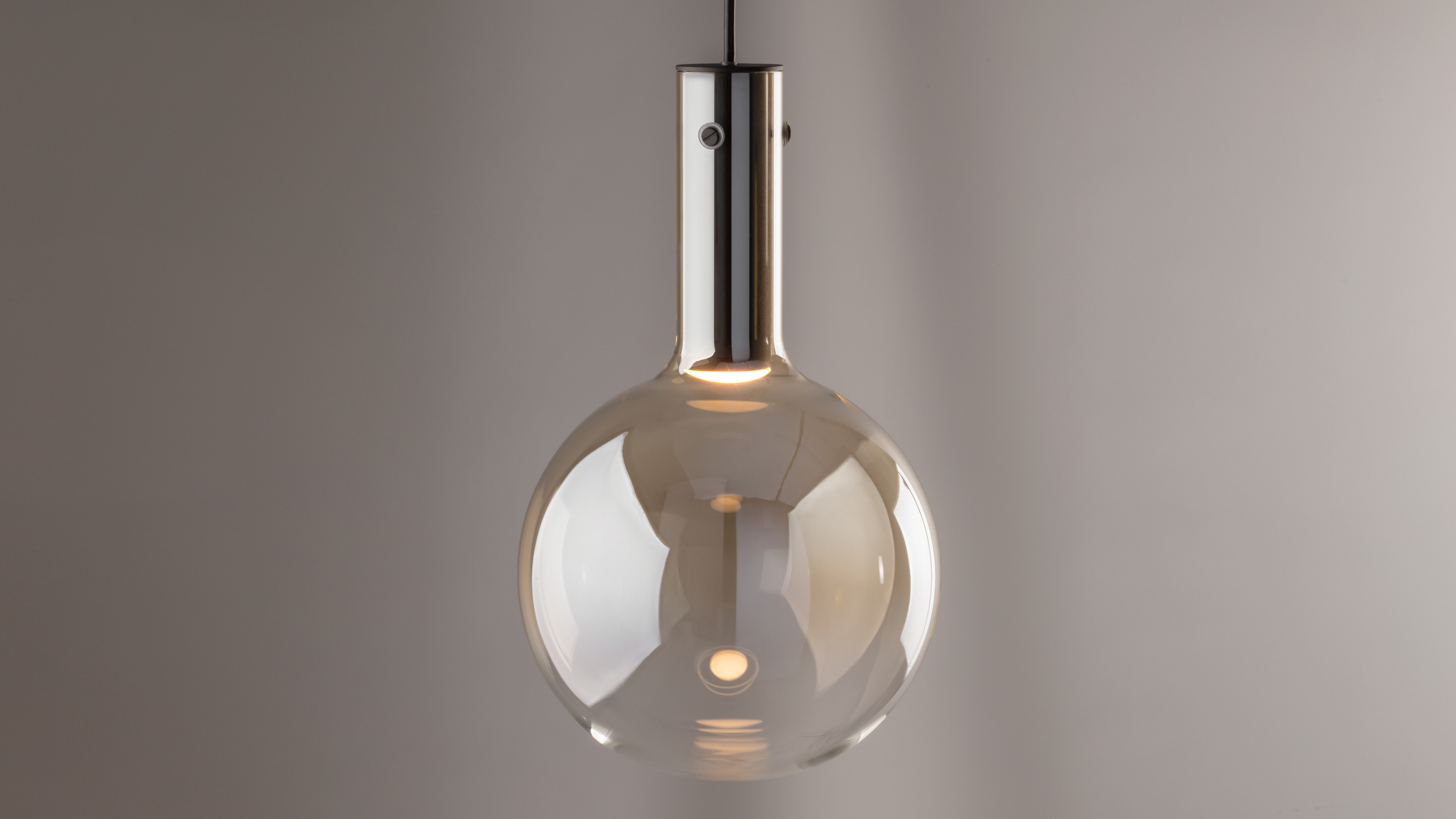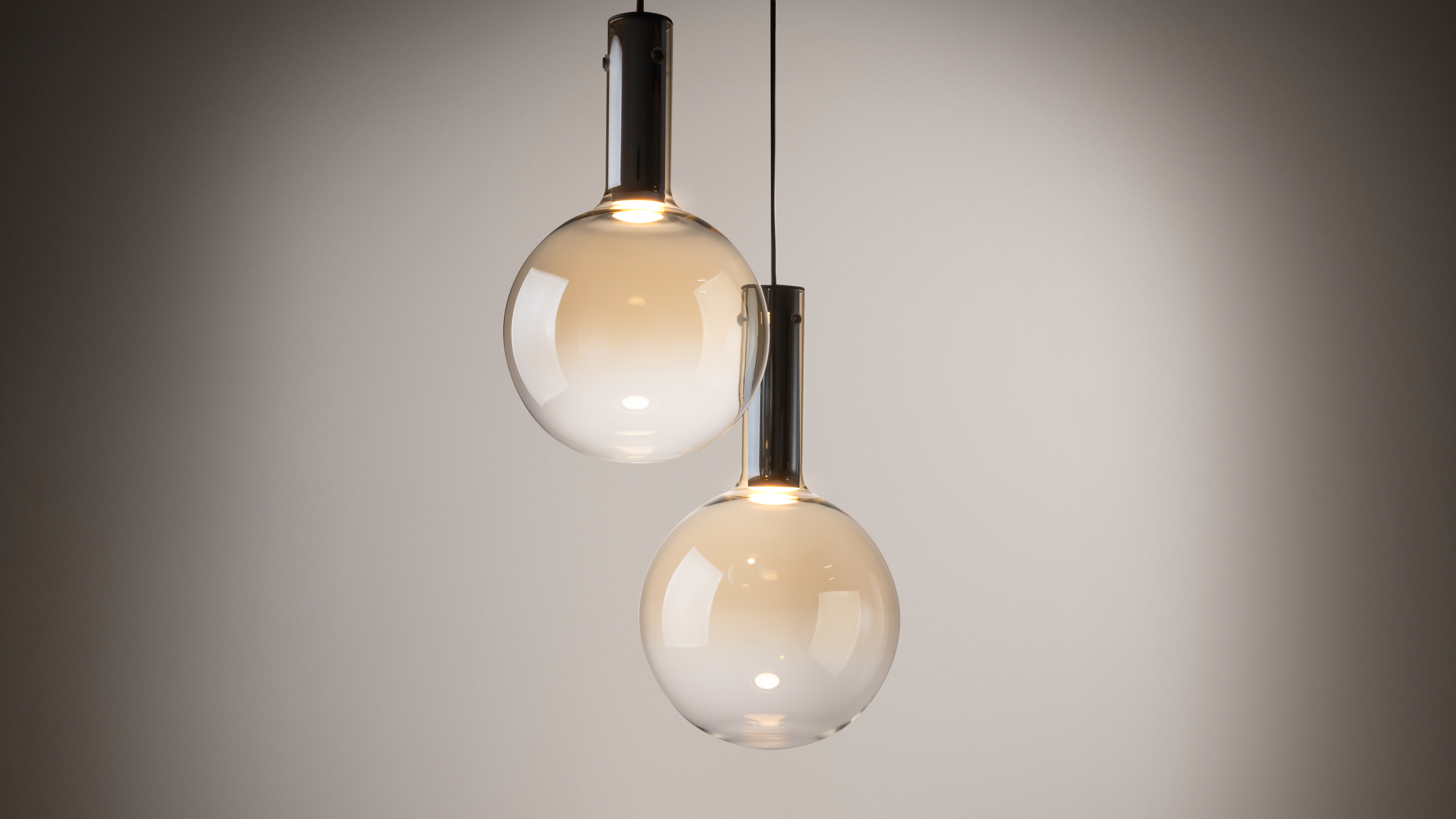 Der Effekt des Schwebens in der Luft wird durch die kugelfцrmigen Lampenschirme aus geblasenem Glas erreicht, die flieЯend in die Beschlдge-Draht-Halterung ьbergehen, und die Farbverlдufe ergдnzen diese Illusion.