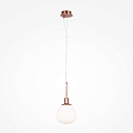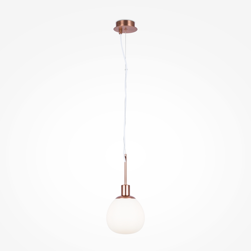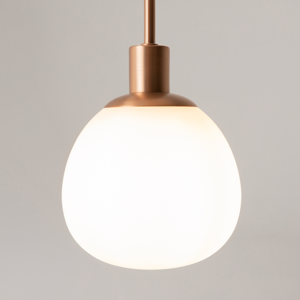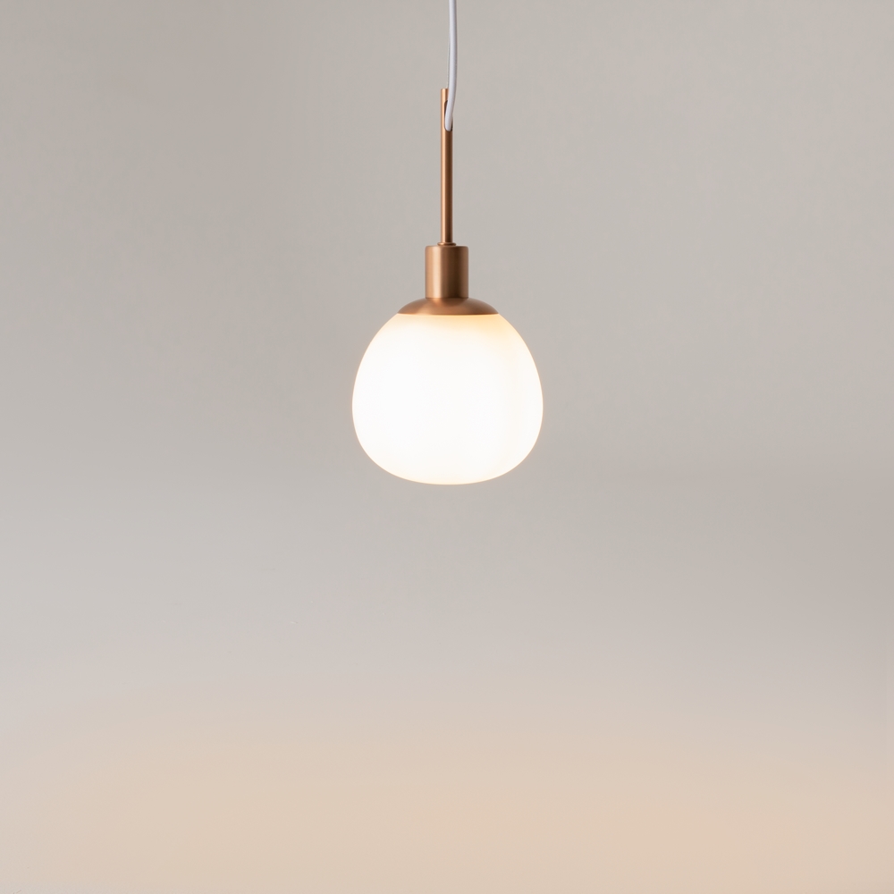 Die weißen, mundgeblasenen Glasschirme erinnern an Perlen, eingefasst in matt bronzefarbenes oder vernickeltes Metall.