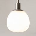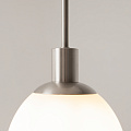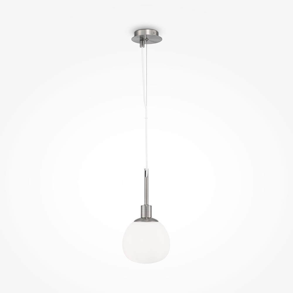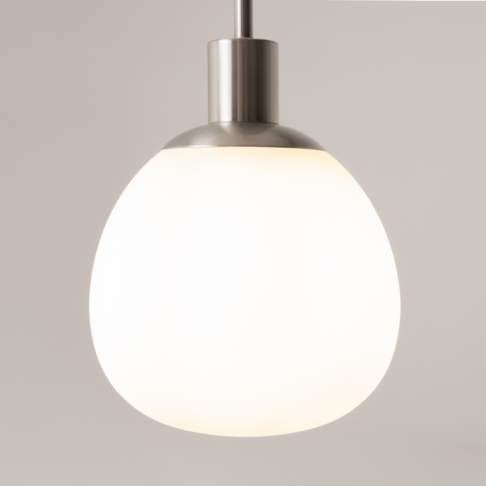 Die weißen, mundgeblasenen Glasschirme erinnern an Perlen, eingefasst in matt bronzefarbenes oder vernickeltes Metall.