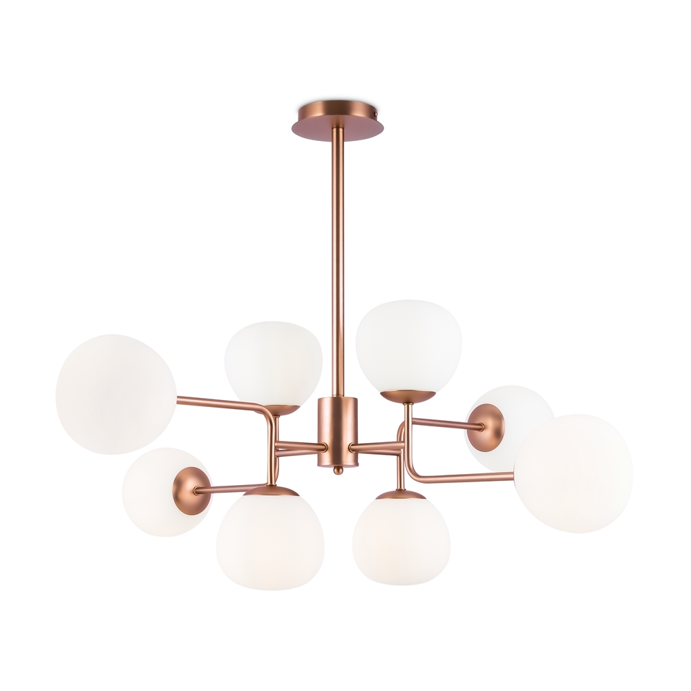 Die weißen, mundgeblasenen Glasschirme erinnern an Perlen, eingefasst in matt bronzefarbenes oder vernickeltes Metall.