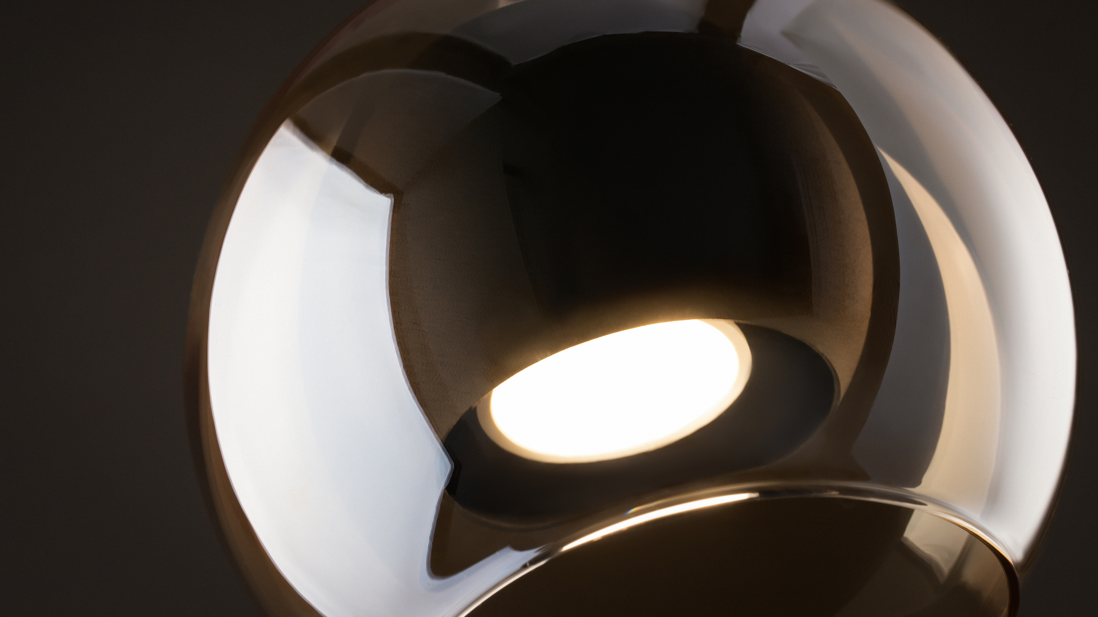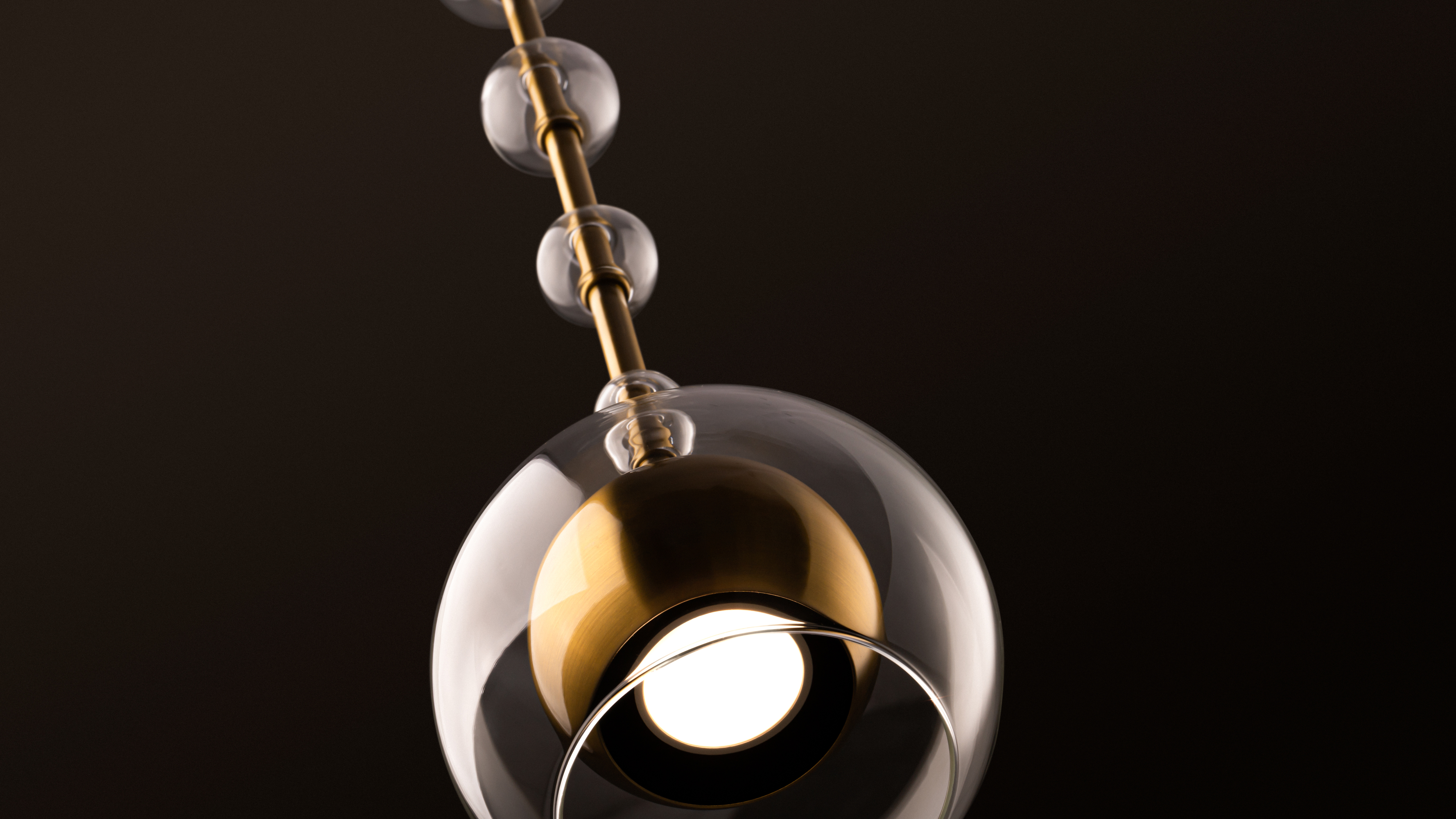 Wie Wassertropfen spiegeln die Lampenschirme und dekorative Elemente aus geblasenem Glas die Farben und Details des Innenraums wider.