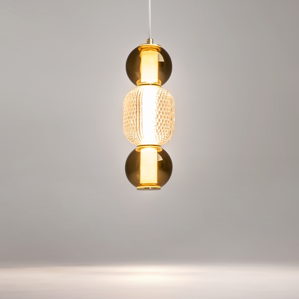 Material der Beschläge - Metall, Farben - Gold, Chrom. Lampenschirme Mix: glatte Kugeln in Farbtönen Cognac oder Rauch + abgerundete Reliefkugeln mit rautenförmigem Muster aus transparentem Glas. Höhenverstellbare Pendelmodelle - maximale Kabellänge 3 Meter. LED-Lichtquelle, Farbtemperatur - 3000К.
