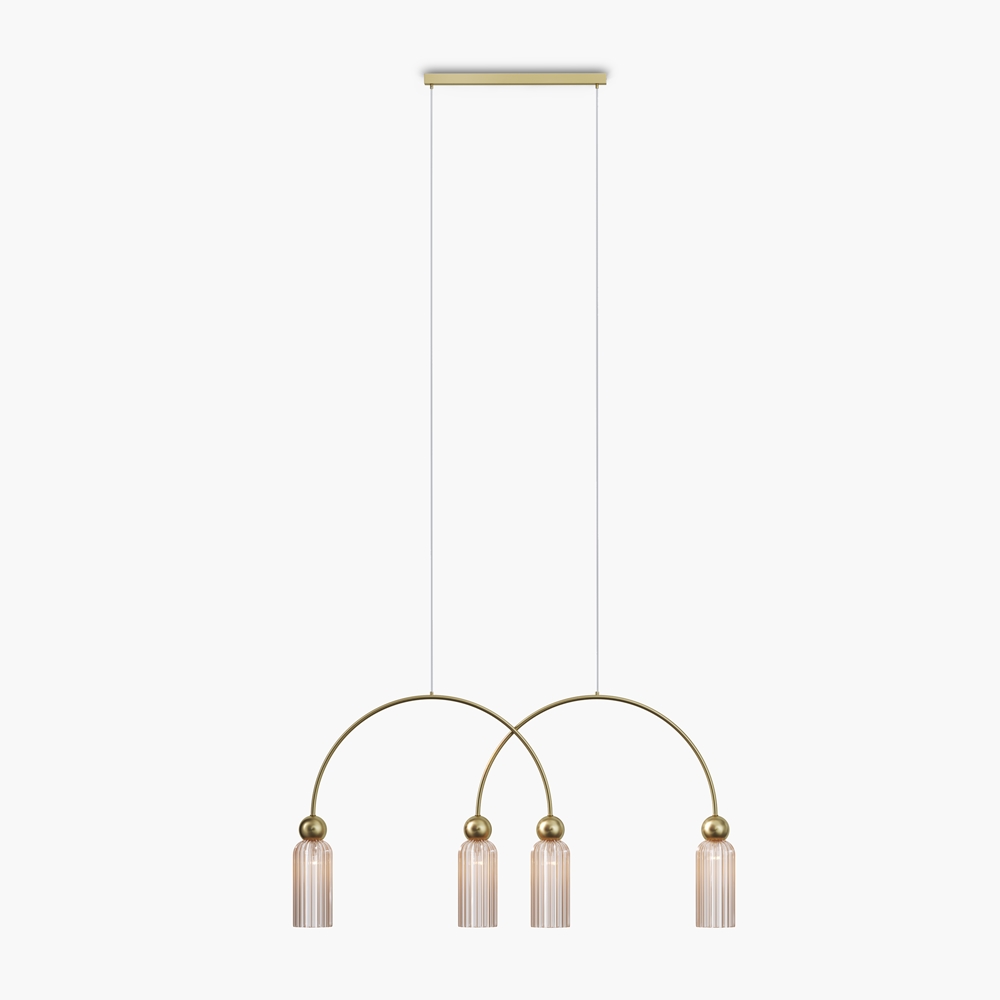 Die Designer haben eine perfekte Balance zwischen klassischen Proportionen und moderner Raffinesse geschaffen. Die Kollektion verkörpert schlichte Eleganz und formale Harmonie – ganz ohne überflüssige Ornamente. Die gerippte Struktur der gegossenen Glasschirme verstärkt das Lichtspiel auf faszinierende Weise und verleiht der Leuchte Tiefe sowie visuelle Spannung.