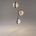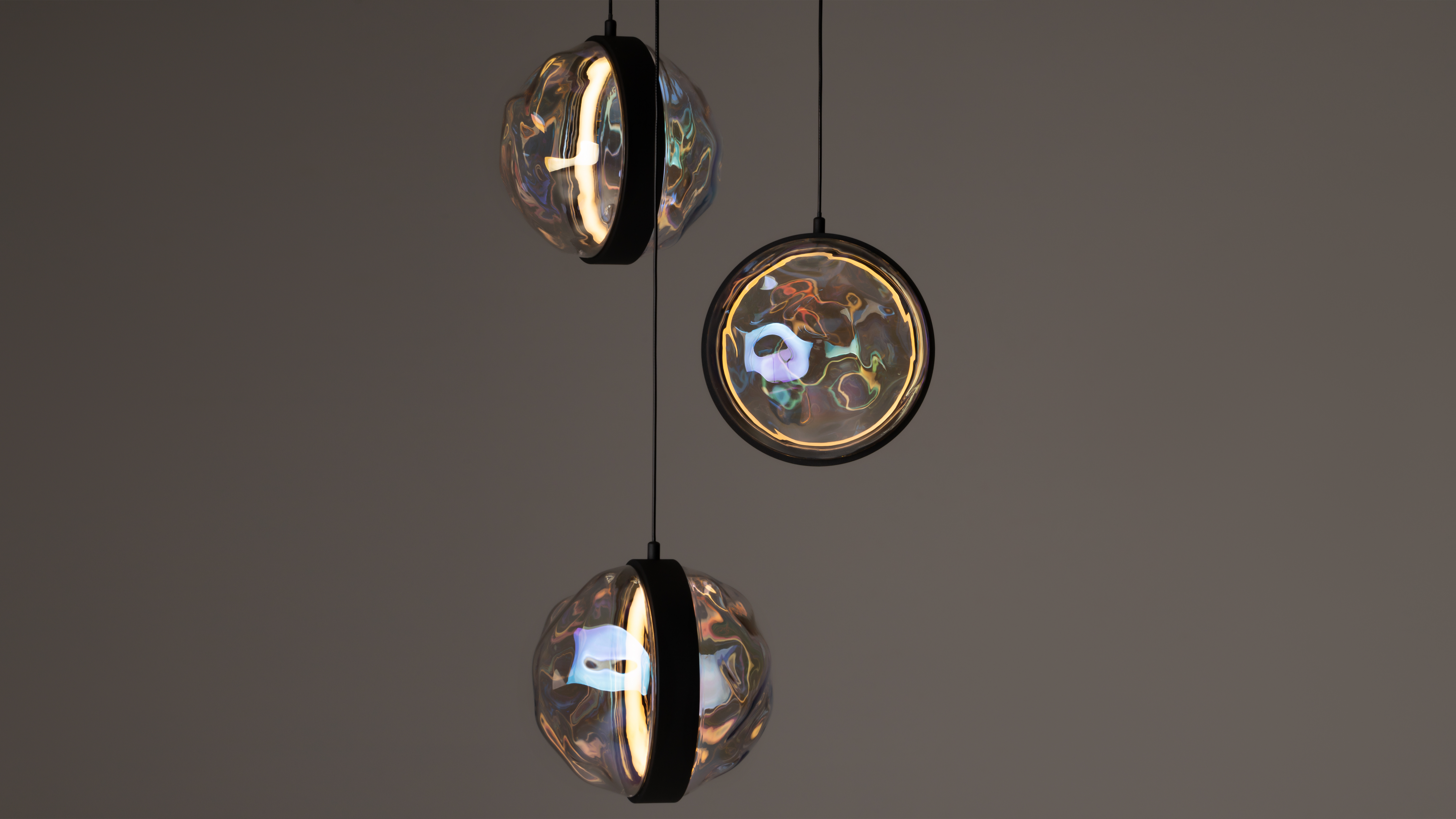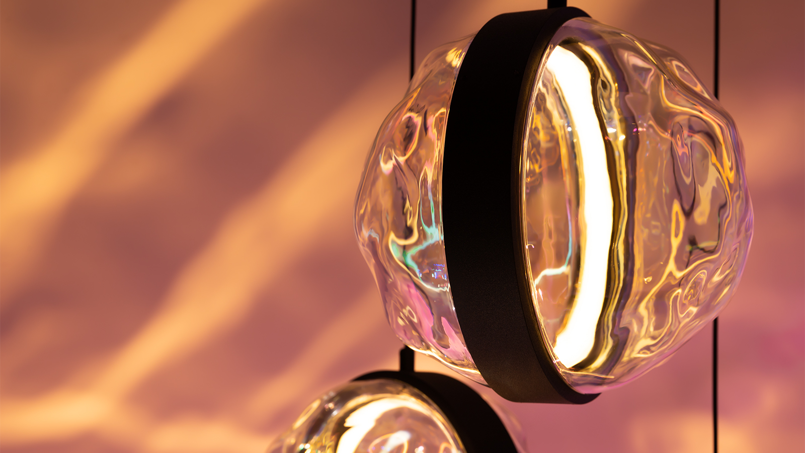 Die wellenförmigen Konturen der Glasschirme erinnern an fließendes Wasser – eingefrorene Bewegung, die sich in einem spektakulären Spiel leuchtender Reflexe offenbart. Ein innovativer, kreisförmiger LEDLichteinsatz, der nach innen strahlt, erzeugt eine weiche, fast schwebende Lichtwirkung.