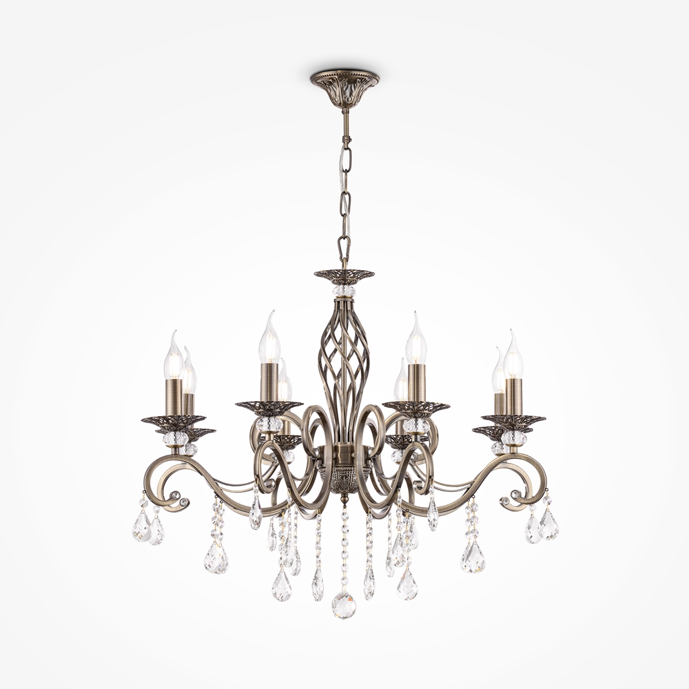 Metallrahmen, weiЯ und gold lackiert. Lampenschirme aus weiЯem plissiertem Organza. Anhдnger aus Kristall.