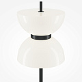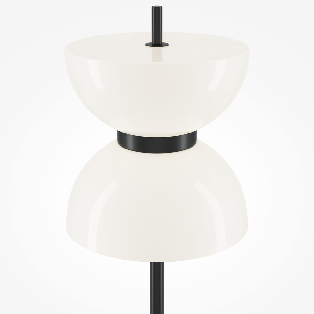 Die Leuchte hat ein einzigartiges Design: Der Metallsockel sind oben und unten mit den Lampenschirmen aus weißem glänzendem Glas versehen. Das lakonische Design hat die praktische Funktion, die Sockelbefestigung zu verbergen und die Leuchte stabil und zuverlässig zu machen.