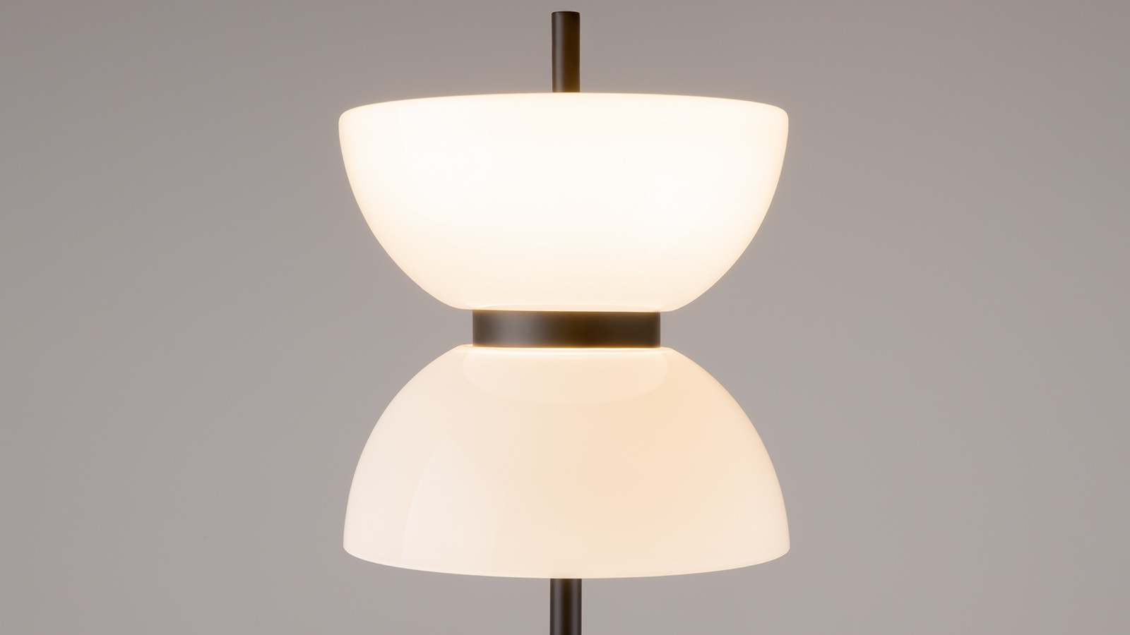 Die Leuchte hat ein einzigartiges Design: Der Metallsockel sind oben und unten mit den Lampenschirmen aus weißem glänzendem Glas versehen. Das lakonische Design hat die praktische Funktion, die Sockelbefestigung zu verbergen und die Leuchte stabil und zuverlässig zu machen.