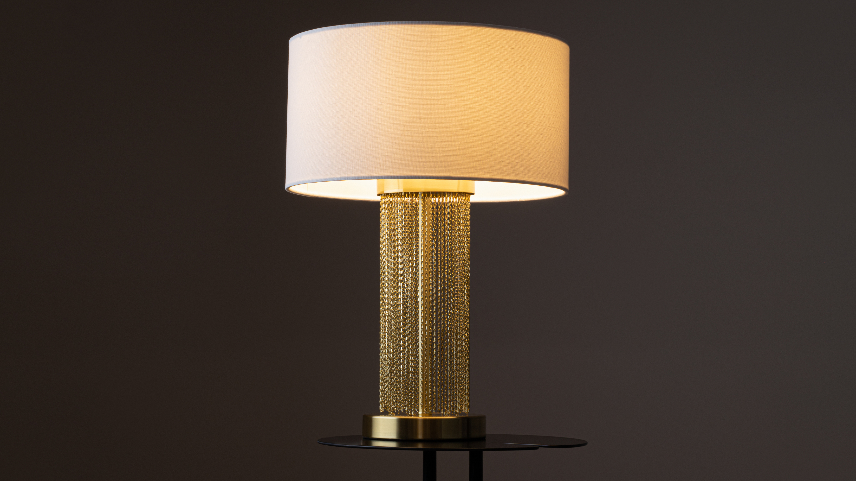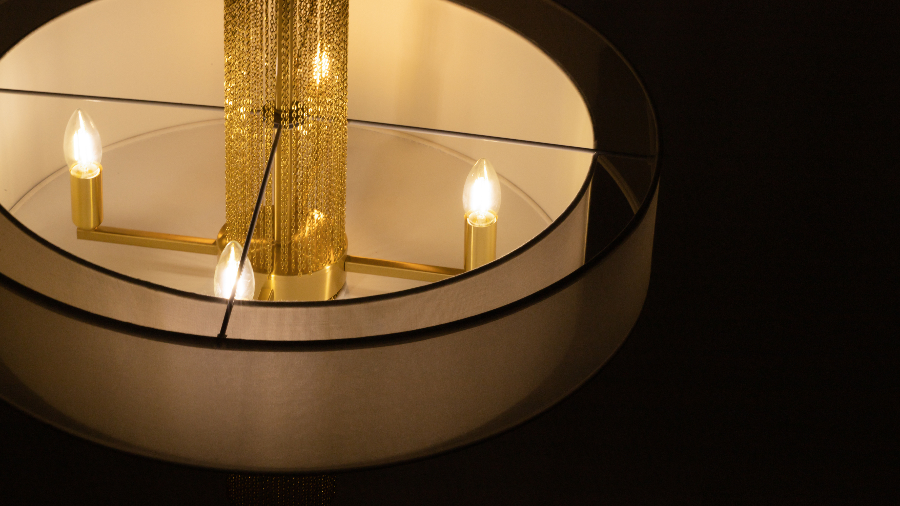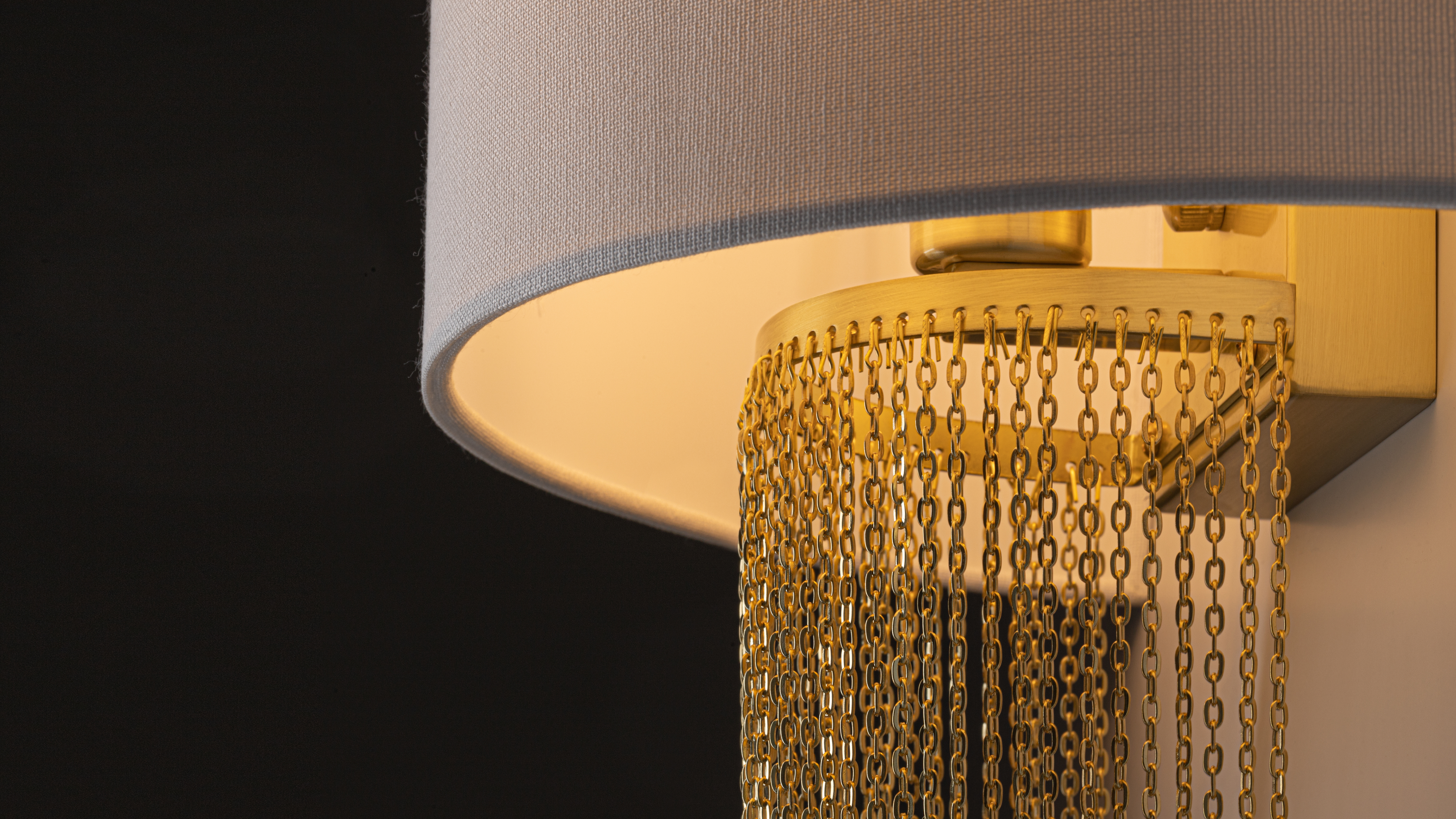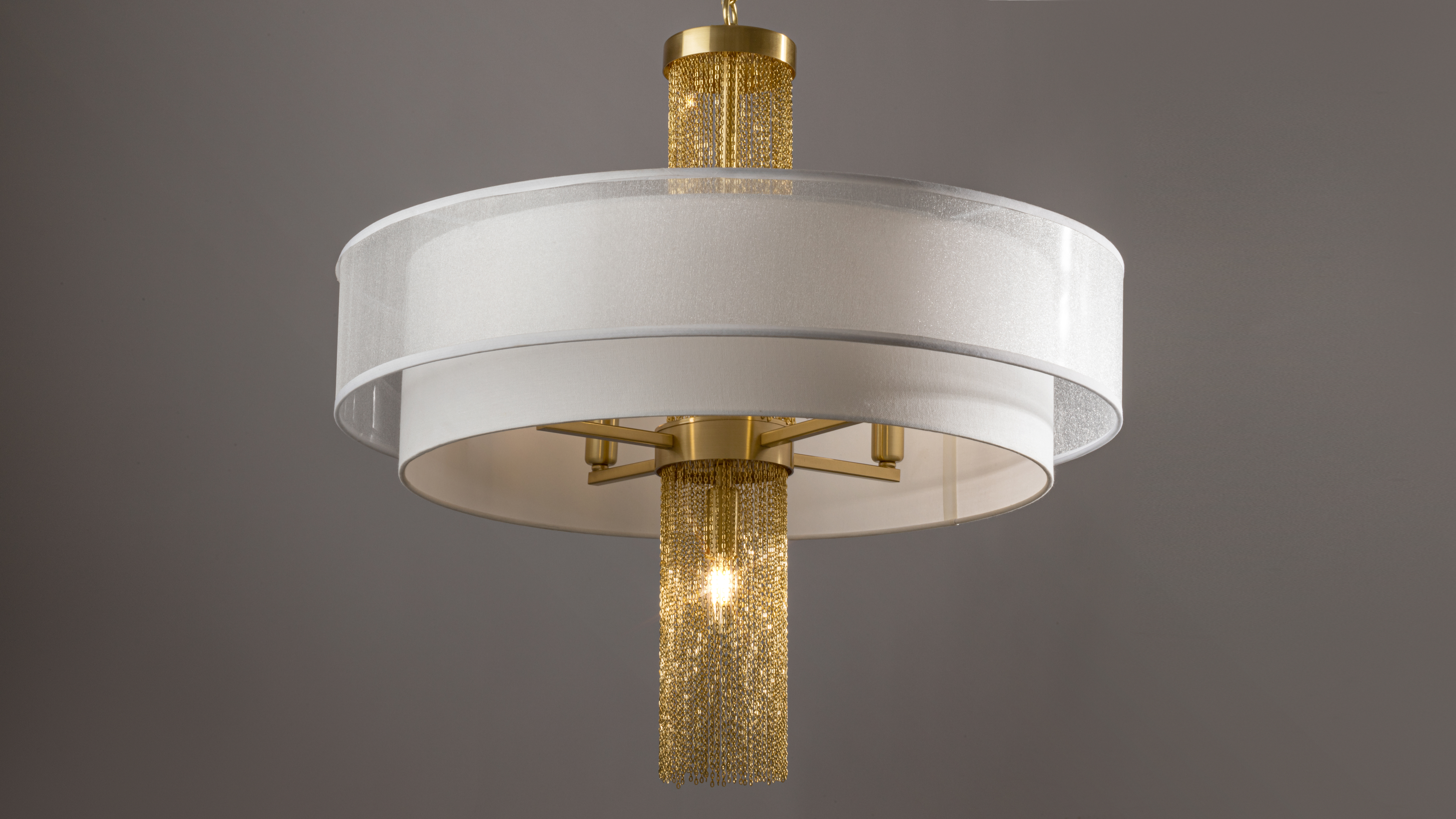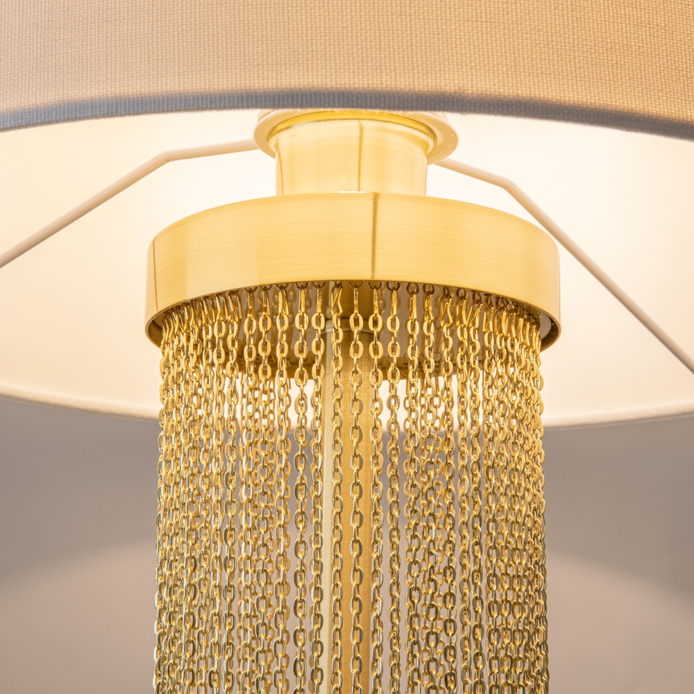 Beschläge aus Edelstahl. Farbe: Gold. Lampenschirm: Weißer Stoff. Dekorative Ketten im Farbton der Beschläge. Der abnehmbare Stoffdiffusor mildert den Lichtstrom. Lichtquelle: Leuchtmittel für Fassung E14.