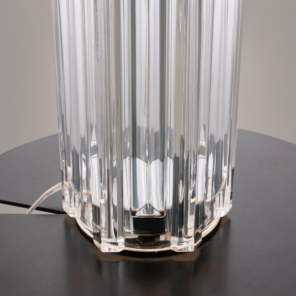 Der textile Lampenschirm aus weißer Baumwolle wird mit transparentem Glas in drei Farbtönen und einem Metallsockel kombiniert.