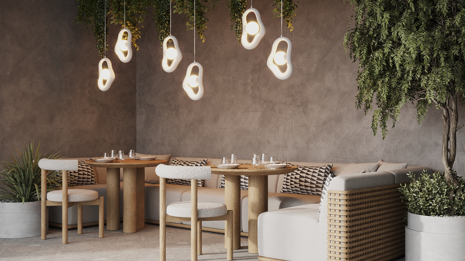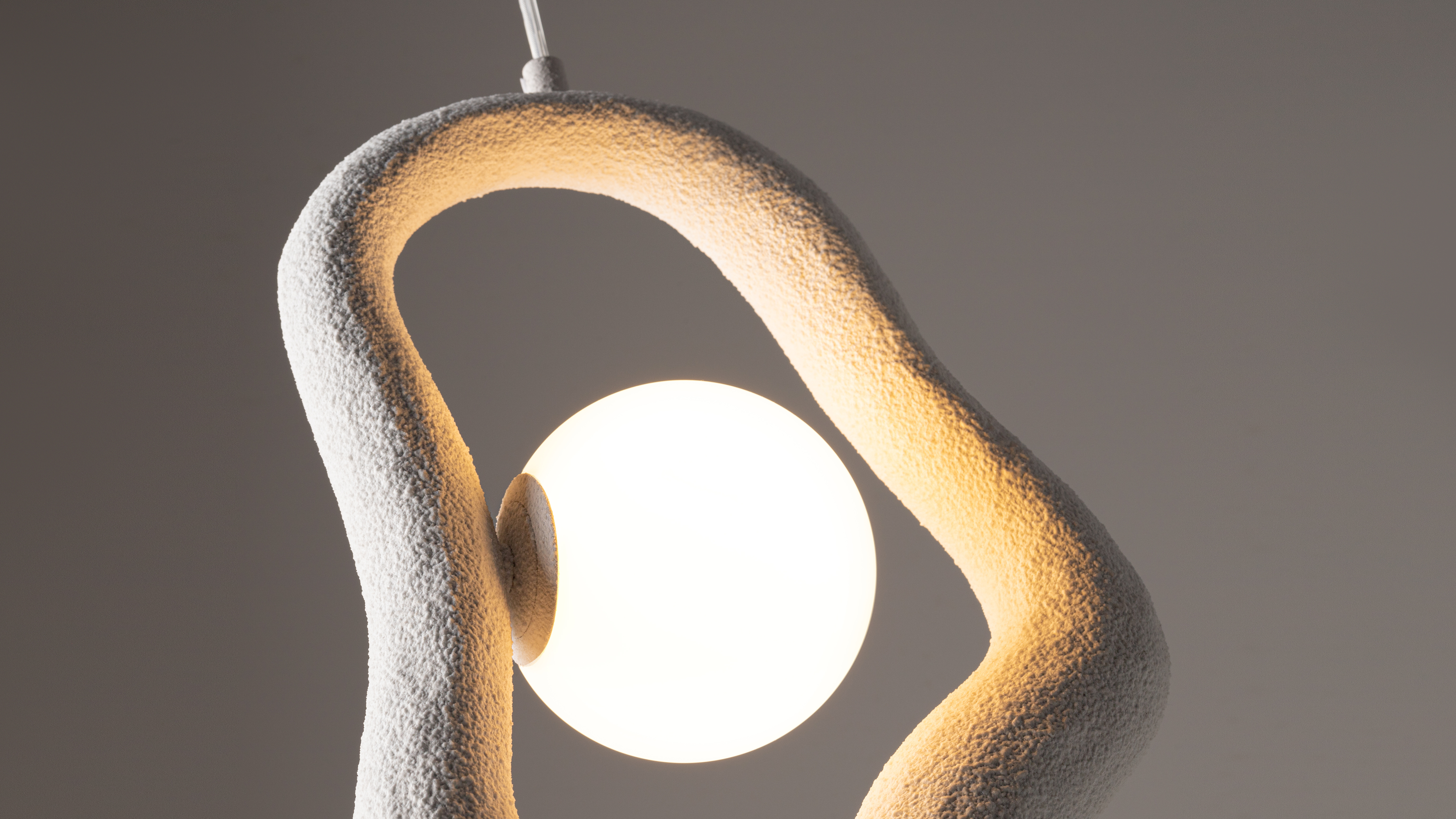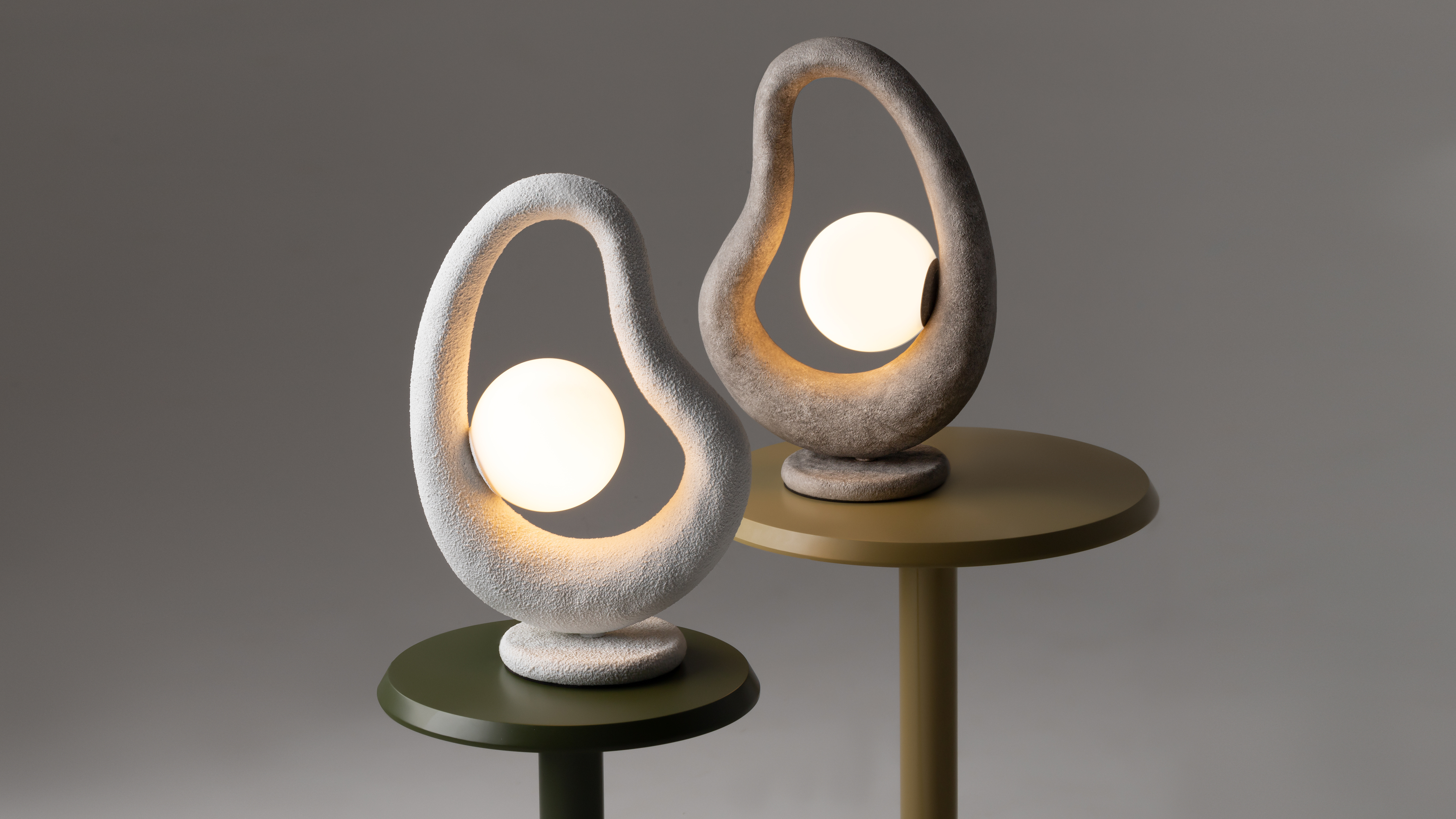 Die Kollektion umfasst Pendel und Tischleuchten mit sanften, organischen Formen, die an natürliche Linienführungen erinnern. Erhältlich in zwei Ausführungen – geschichtetem Beton oder strukturierter Weißbeschichtung – werden die skulpturalen Silhouetten dieser Leuchten zu wahren Kunstobjekten im Raum.