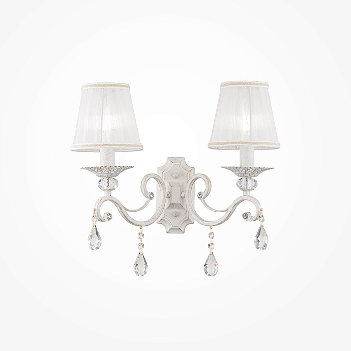 Metallrahmen, weiЯ und gold lackiert. Lampenschirme aus weiЯem plissiertem Organza. Anhдnger aus Kristall.