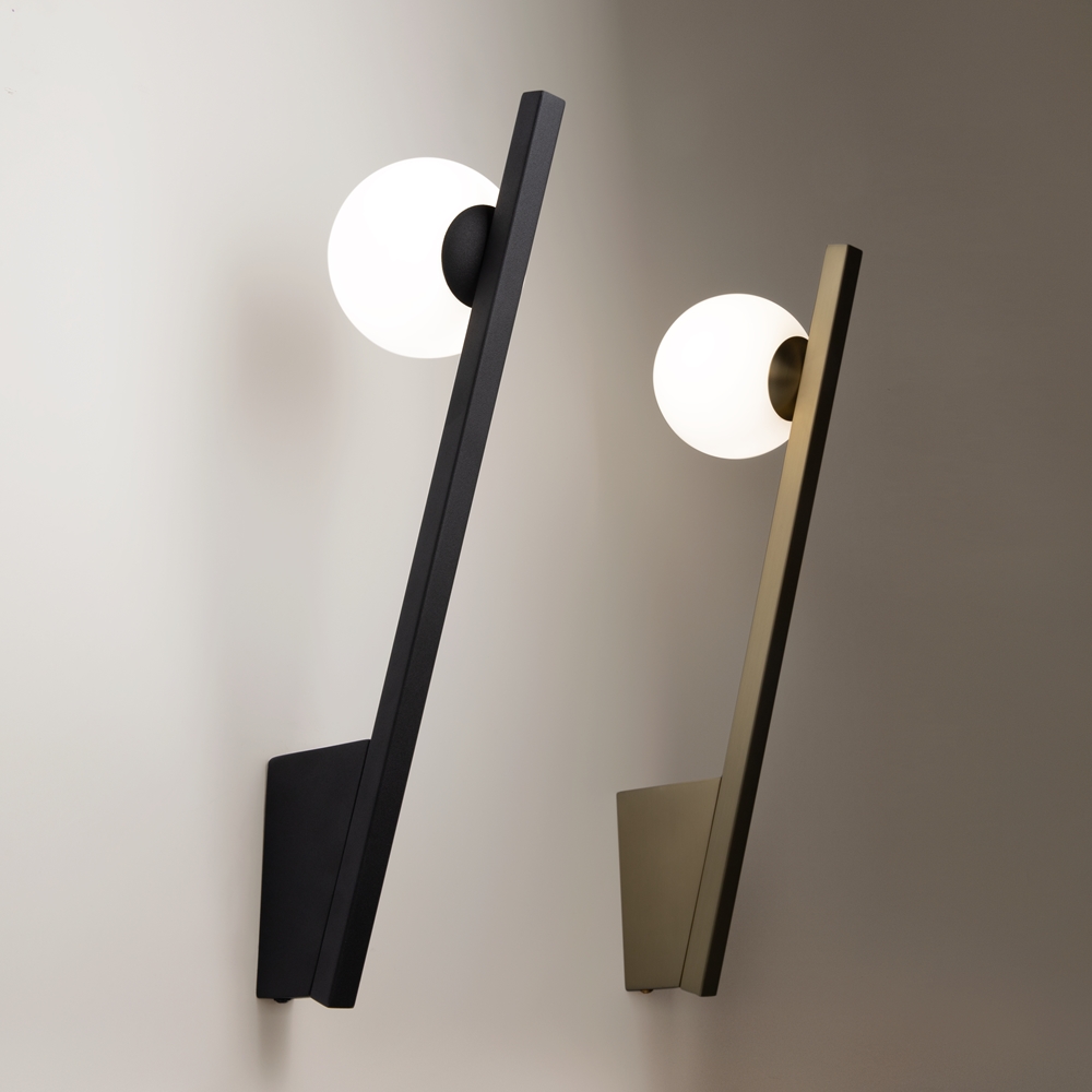Die Modelle mit Beschlägen in Schwarz und Gold werden durch einen Lampenschirm aus matt weißem Glas ergänzt.