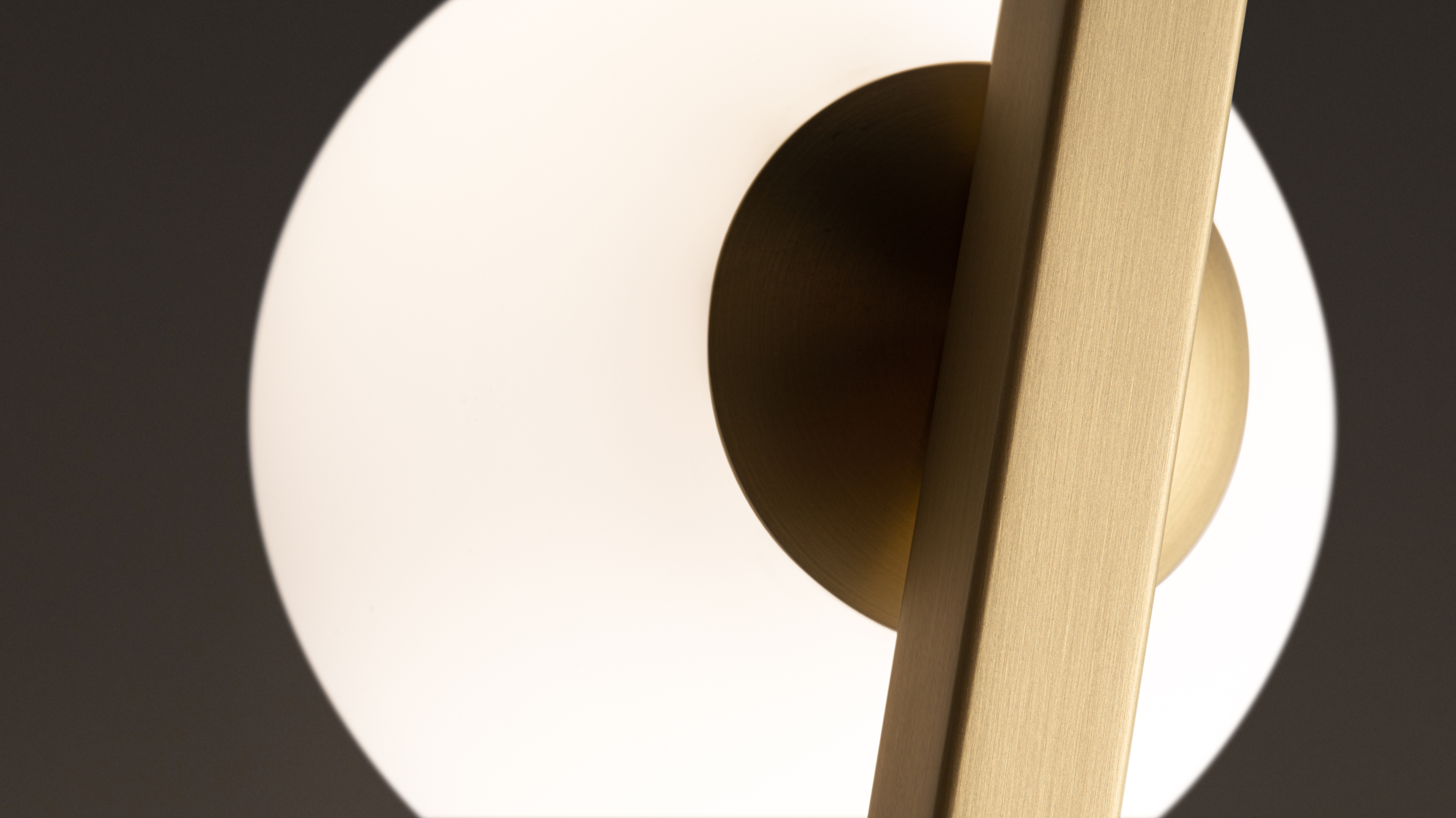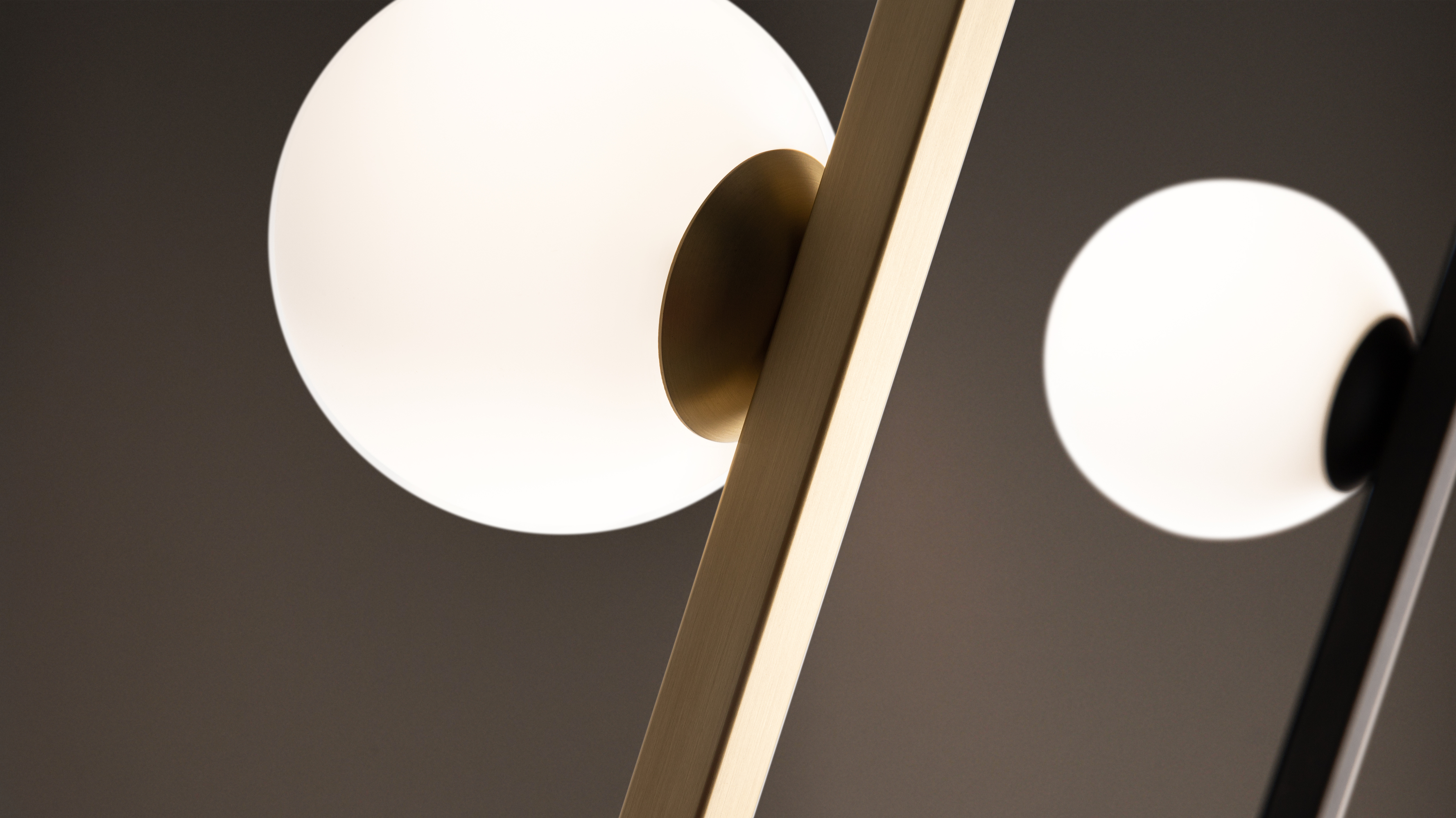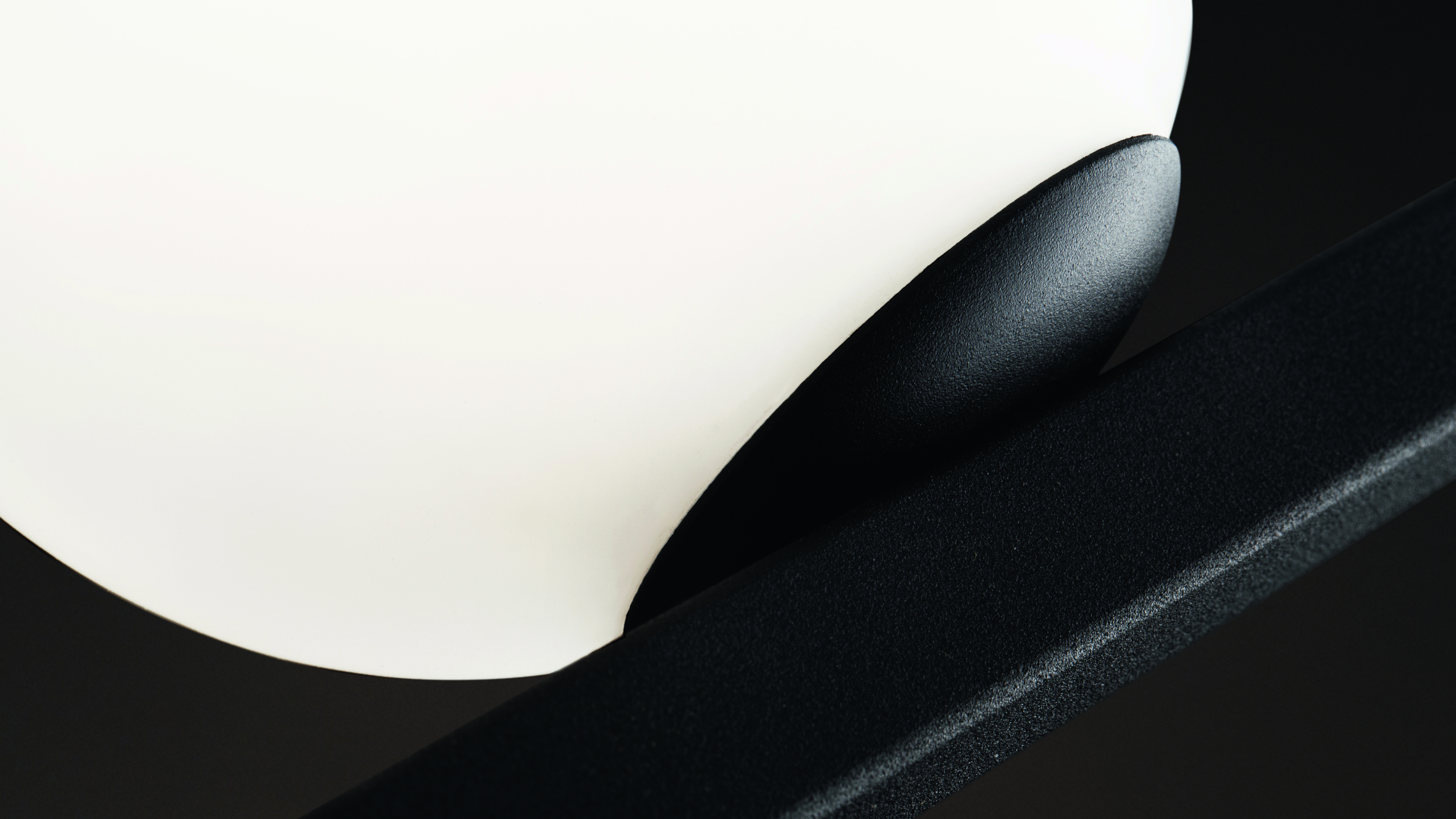 Die Modelle mit Beschlägen in Schwarz und Gold werden durch einen Lampenschirm aus matt weißem Glas ergänzt.