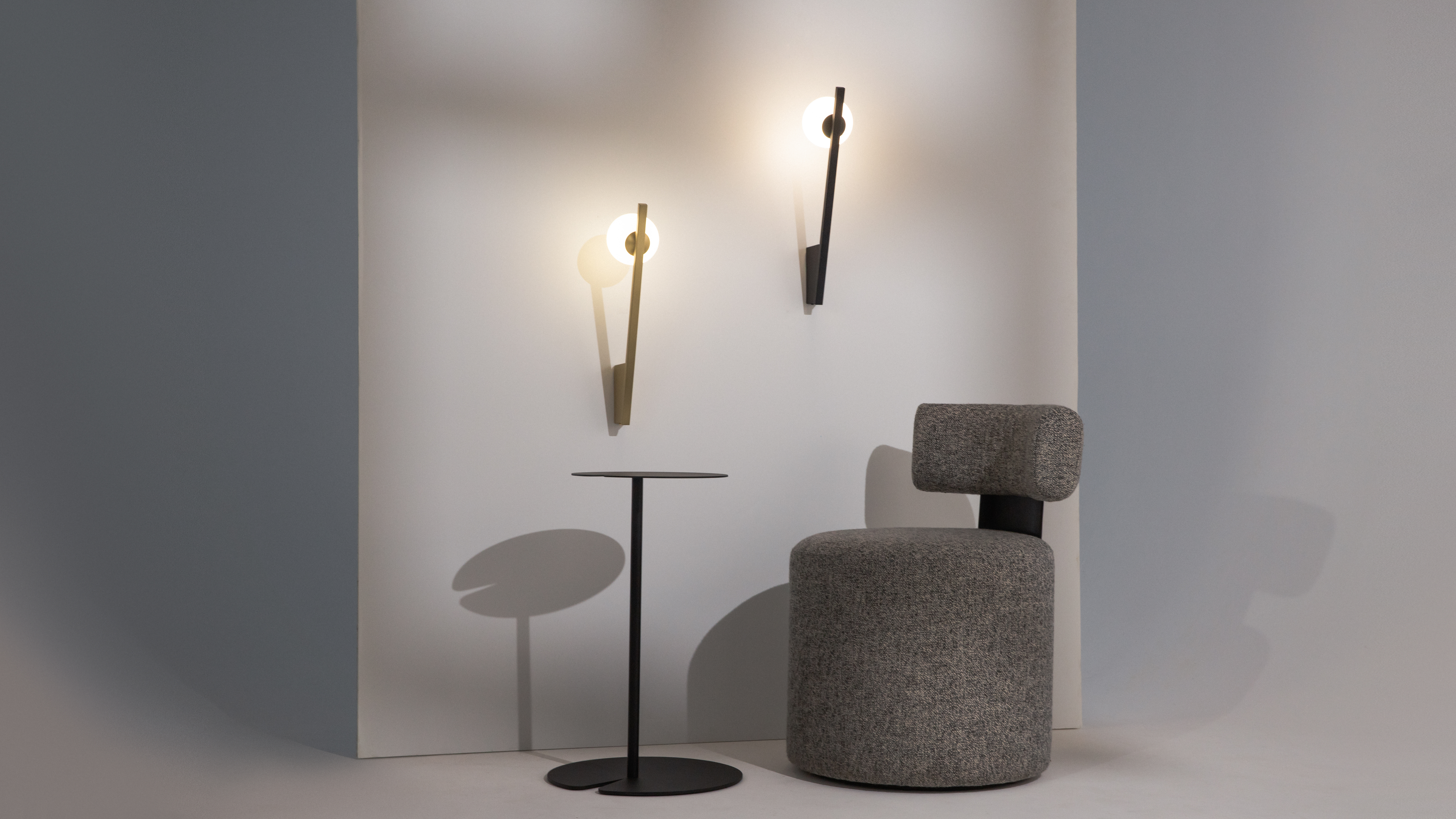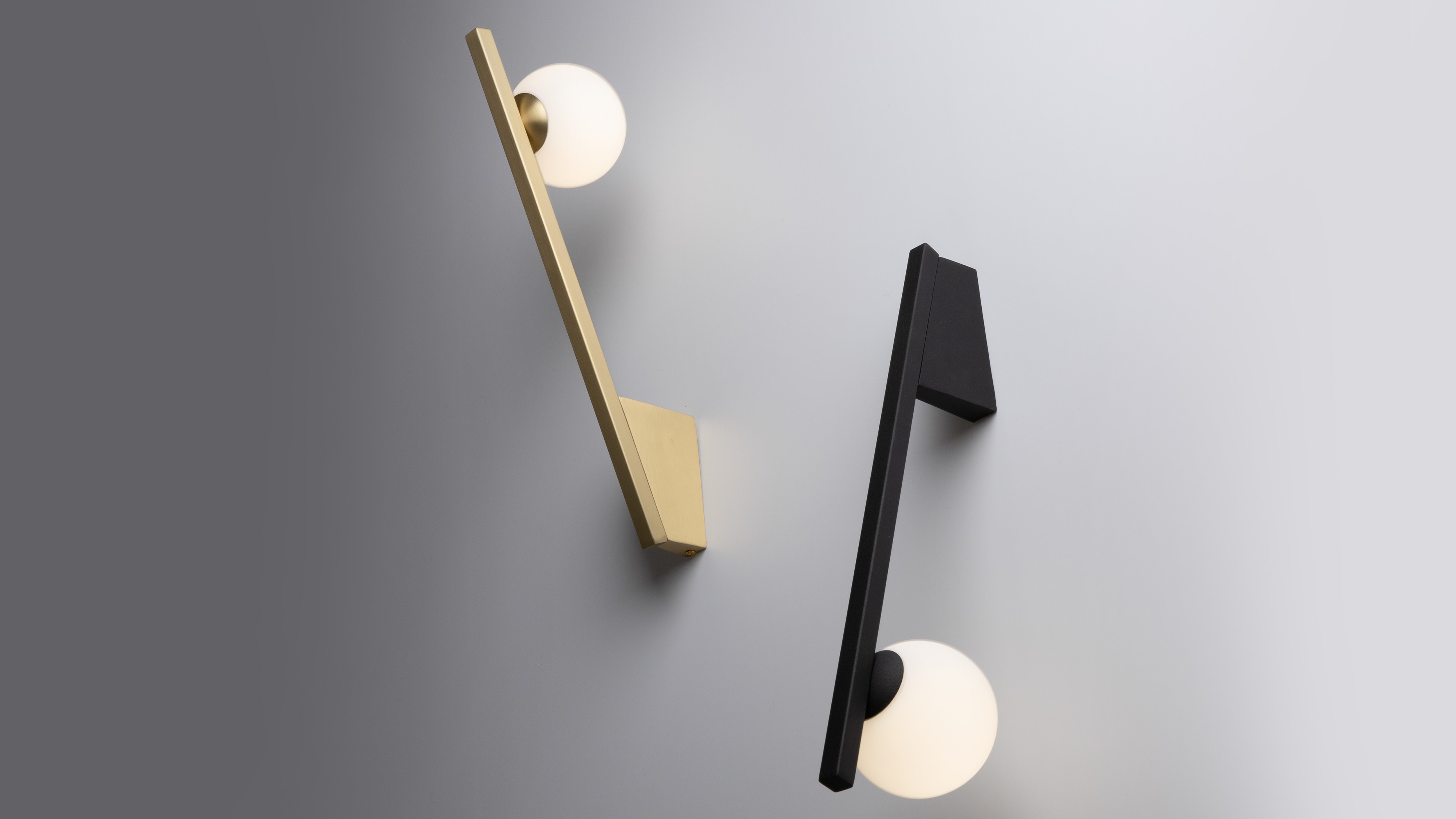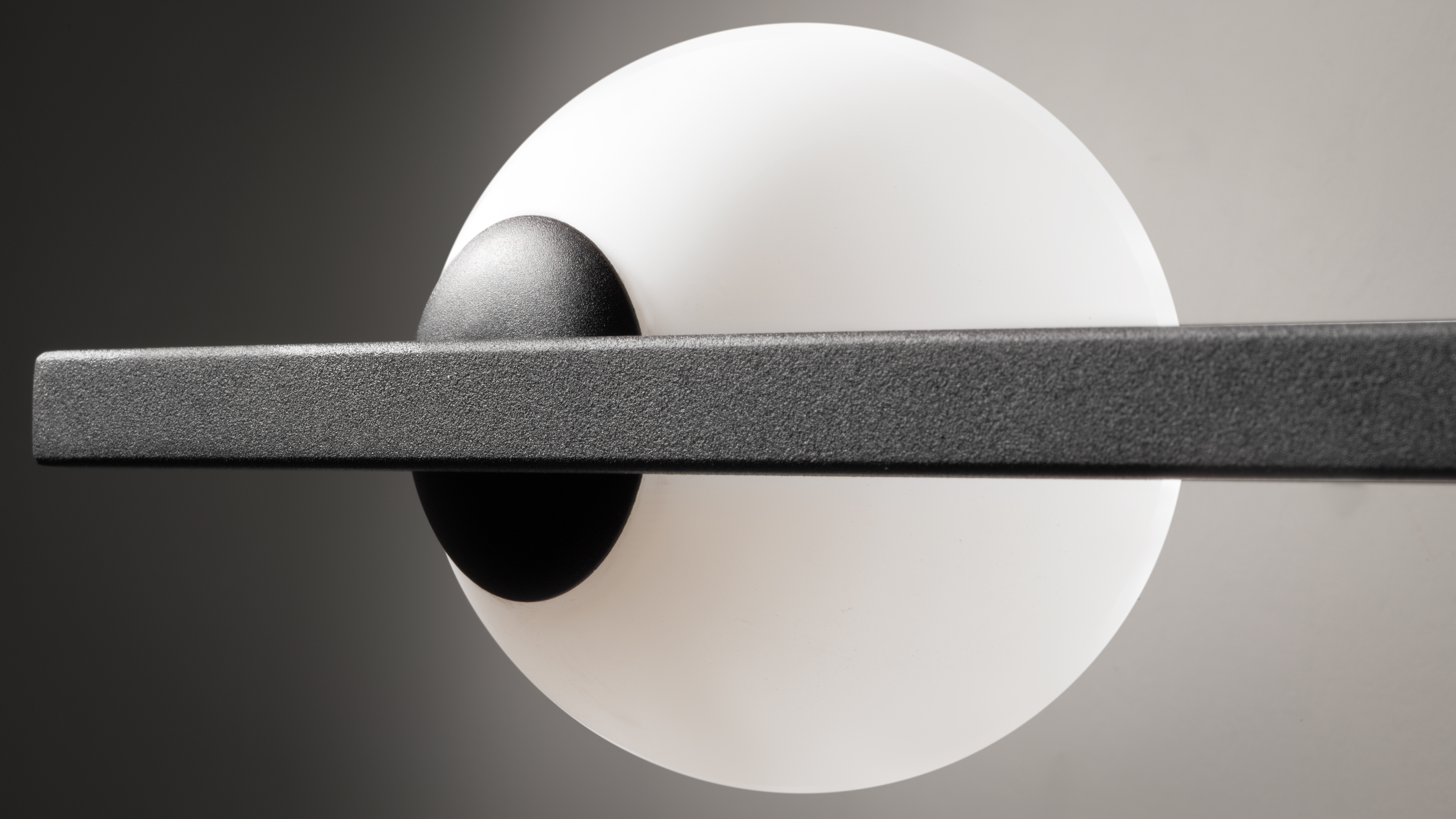 Die Modelle mit Beschlägen in Schwarz und Gold werden durch einen Lampenschirm aus matt weißem Glas ergänzt.