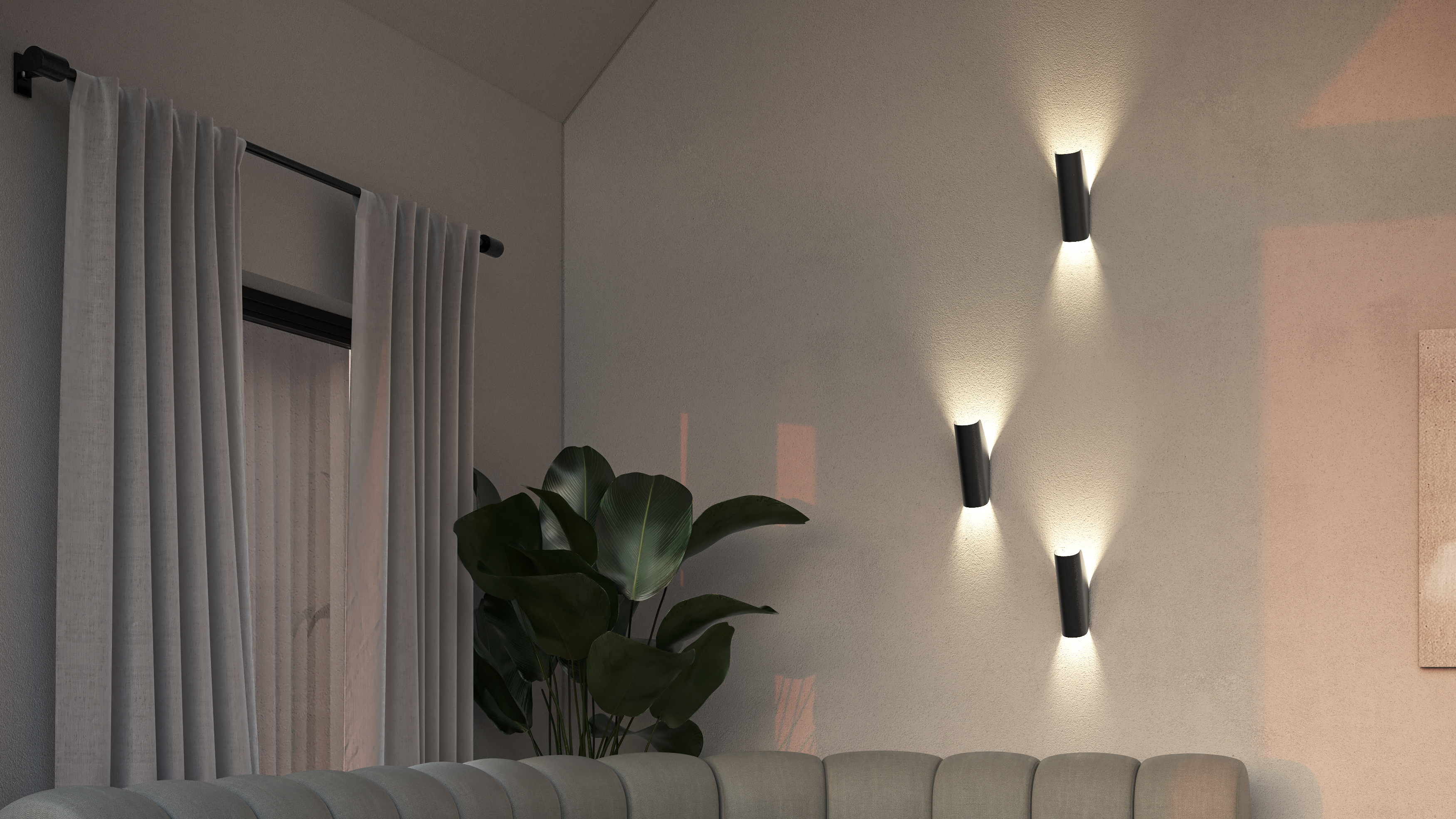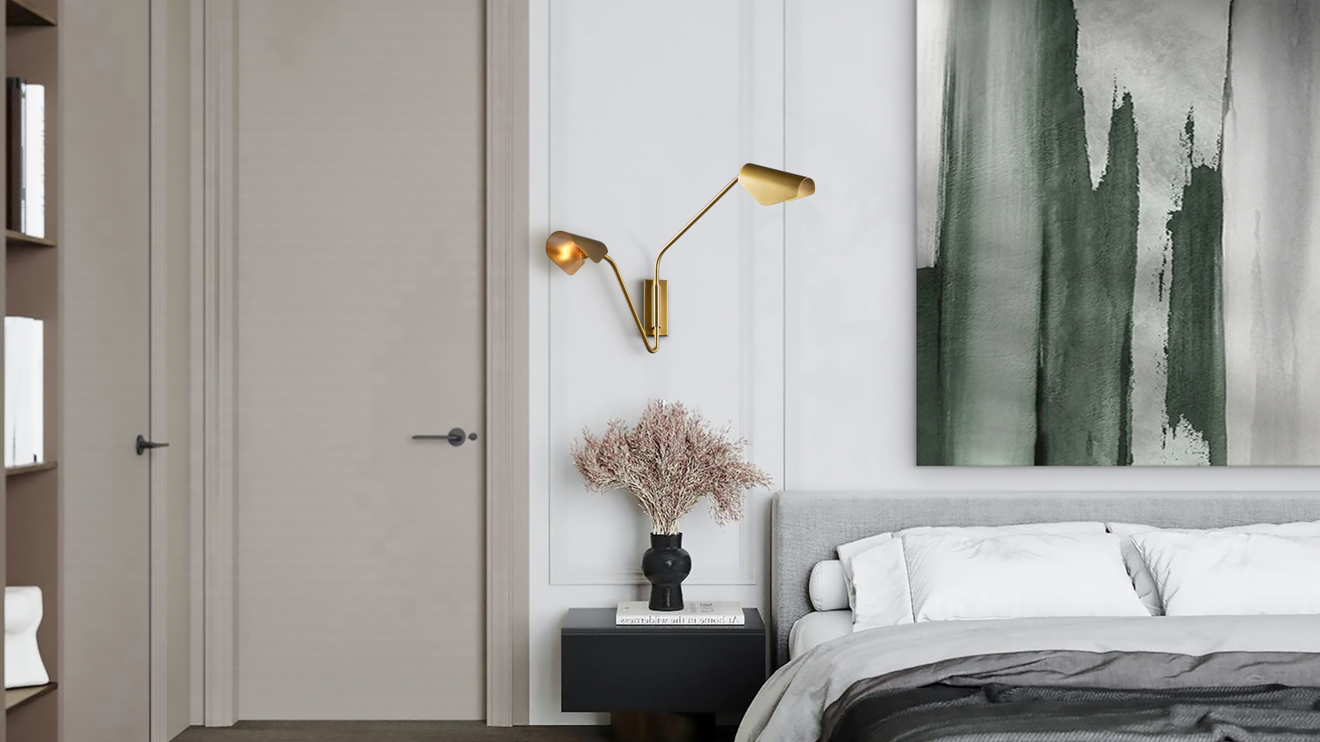 Metallbeschläge in 3 Farbtönen: Messing, mattes Schwarz und mattes Weiß. Eigenartige Geometrie im Design. Bidirektionaler Lichtstrom: nach oben und nach unten. Kompakte Abmessungen. Akzentbeleuchtung.