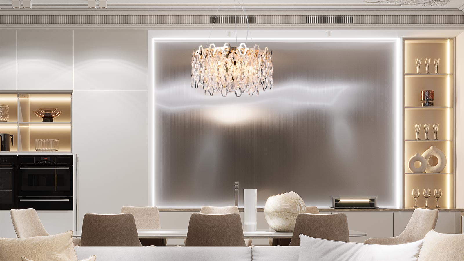 Metallbeschläge in Gold. Dekorative Anhänger: Strukturiertes Glas und Metallplatten. Trendige geometrische Formen. Spektakuläres Spiel des Lichts im Dekor. Breite Auswahl für allgemeine und Zonenbeleuchtung.