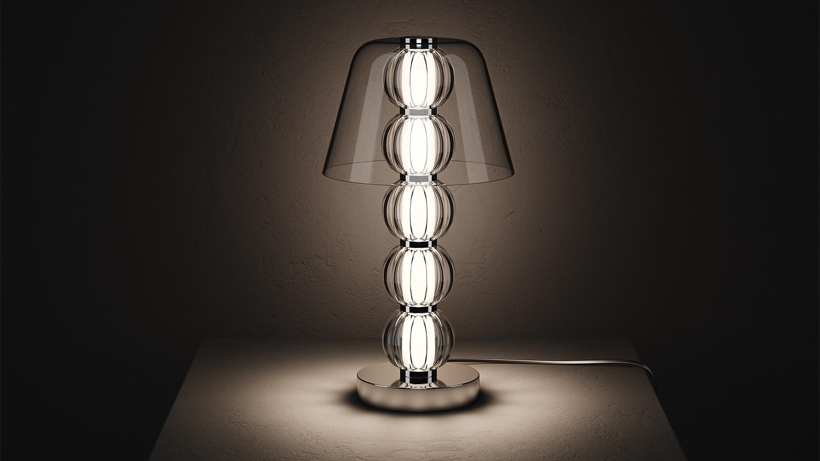 Ihre Komposition besteht aus mundgeblasenem Glas mit feinem Reliefmuster, das eindrucksvolle Lichtspiele erzeugt. Die einzelnen Glaskörper sind wie Perlen aufgereiht und werden von einem LED-Lichtfaden durchzogen, der sie von innen heraus erstrahlen lässt.
