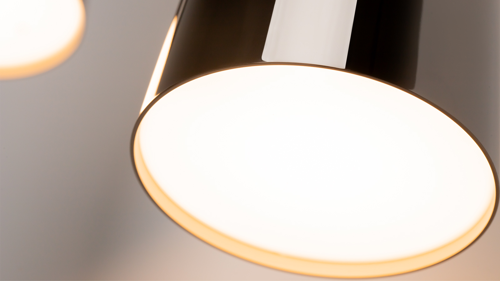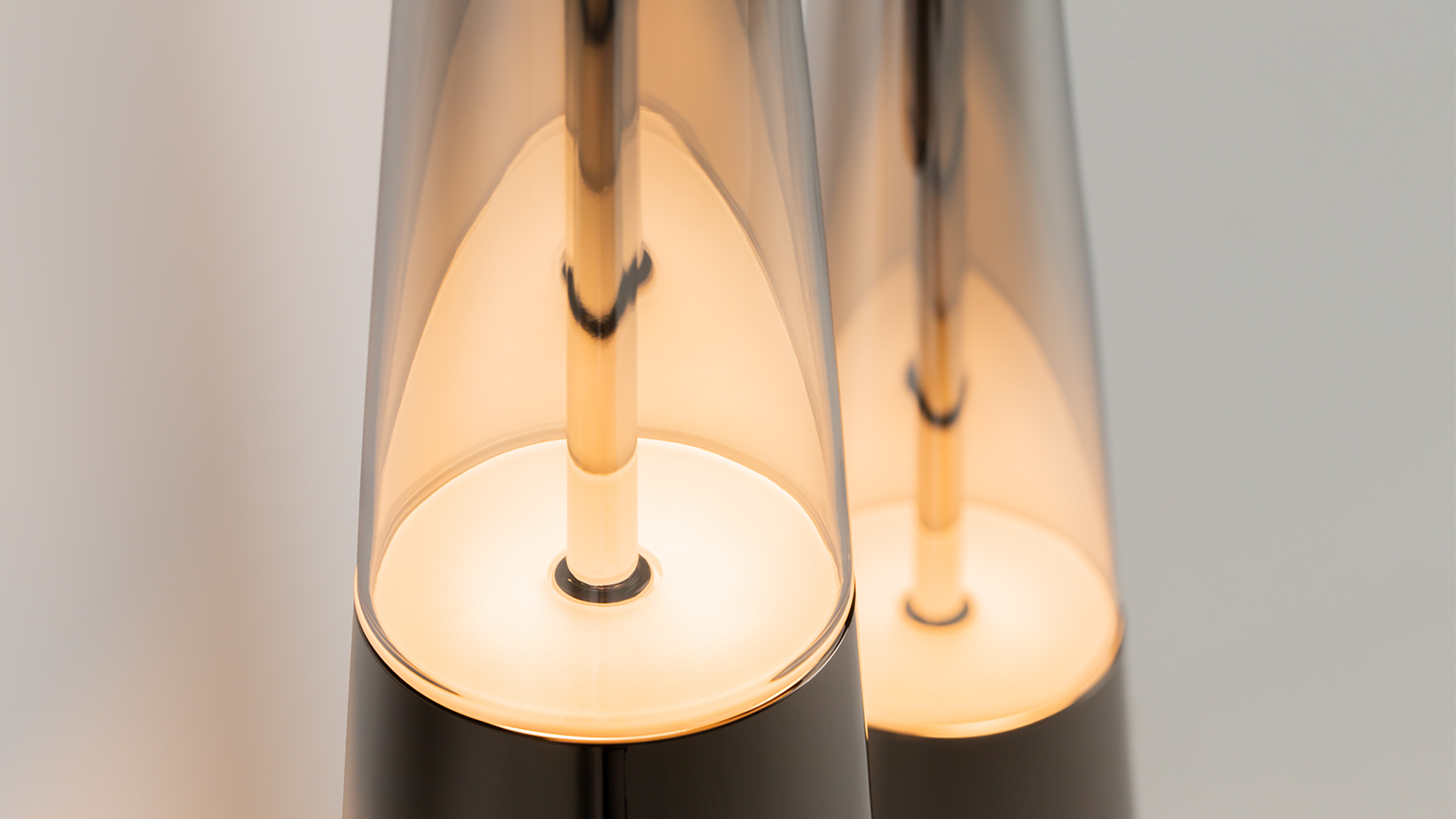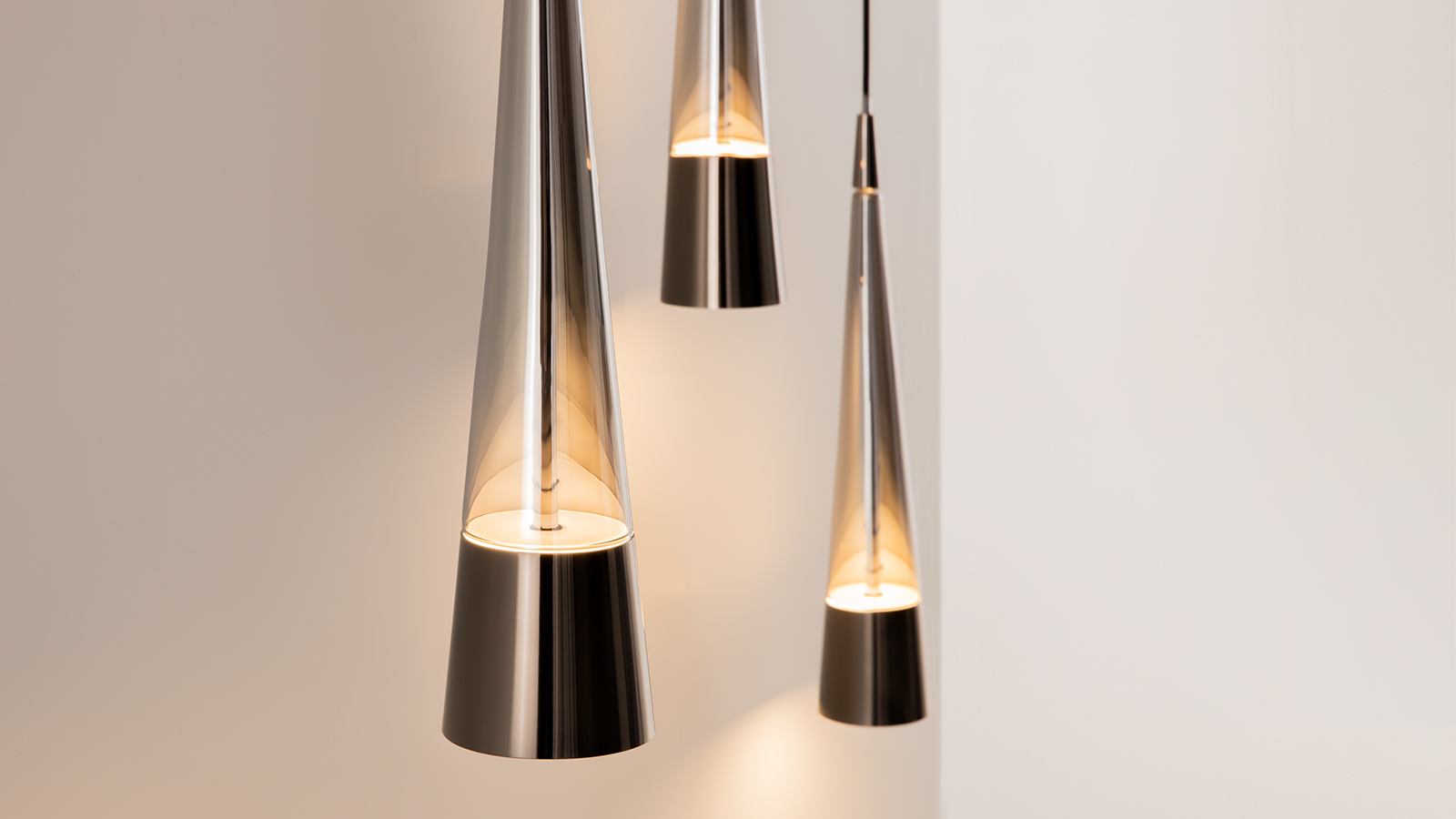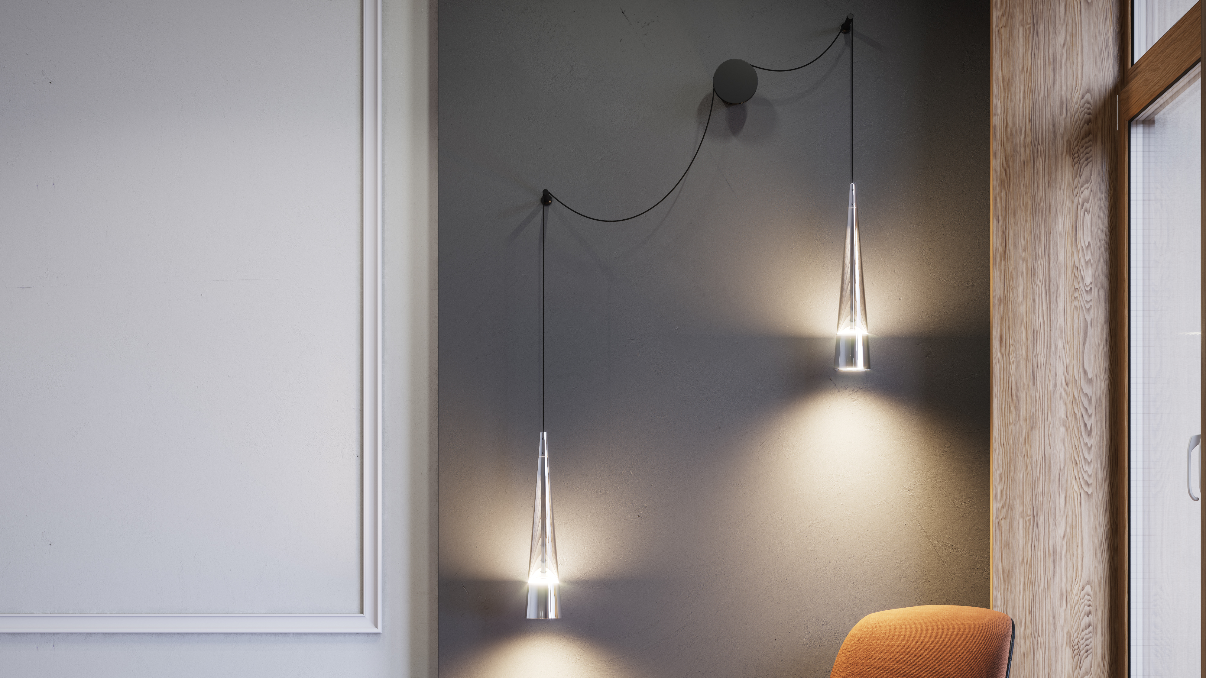 Verchromte Metallbeschläge. Lampenschirme aus Glas, in Chrom. LED-Lichtquelle mit einer Farbtemperatur von 3000K. Bidirektionaler Lichtstrom: nach oben und nach unten gerichtet. Optischer Welleneffekt auf dem äußeren Glaselement.
