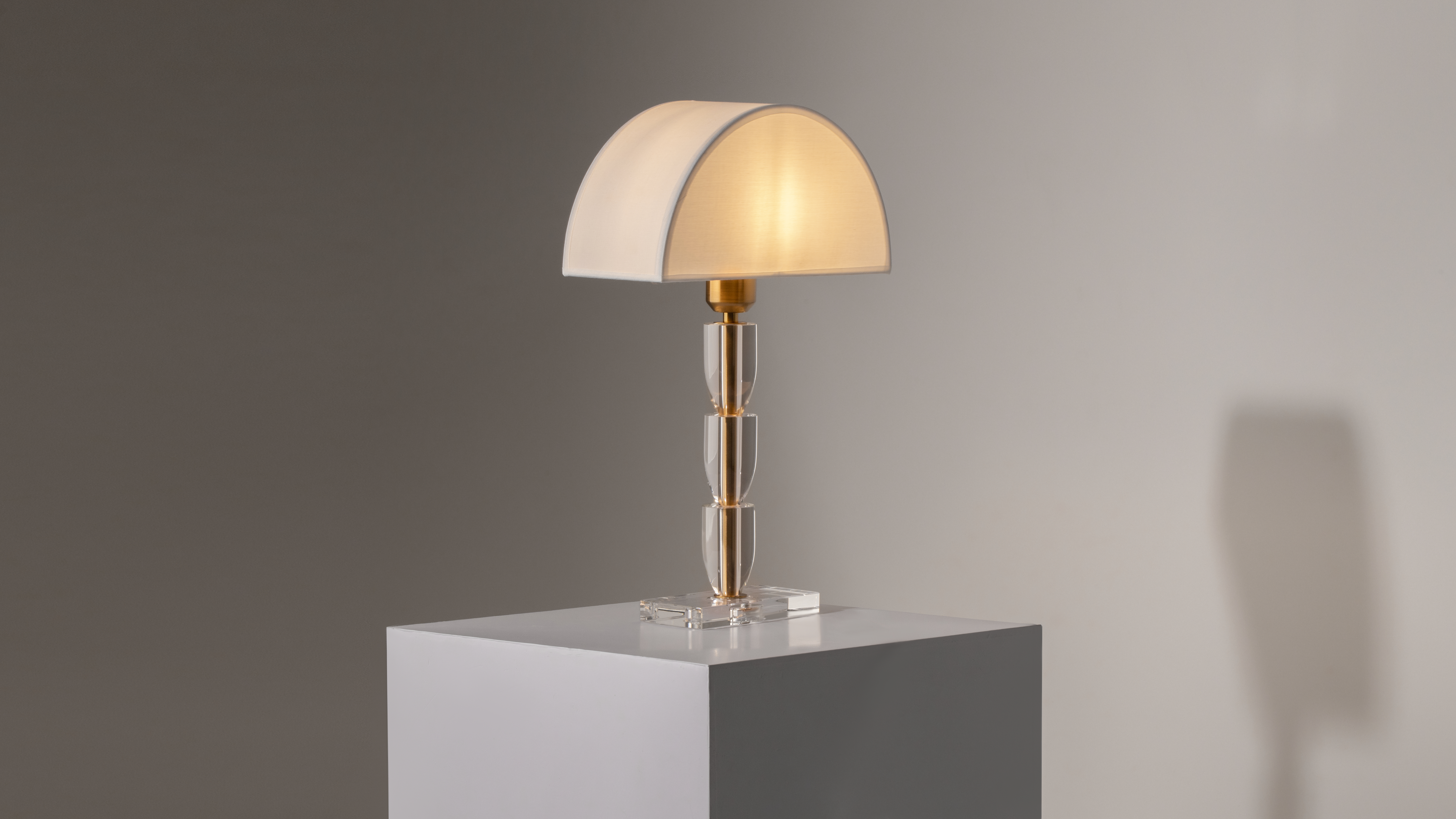 Metallbeschläge. Farbtöne: Chrom, Messing. Lampenschirm aus Baumwolle in Weiß. Transparenter Acryldekor am Sockel. Die Ästhetik des Bauhauses, die trendige Form des Lampenschirms. Lichtquelle: Leuchtmittel für E27-Fassung.