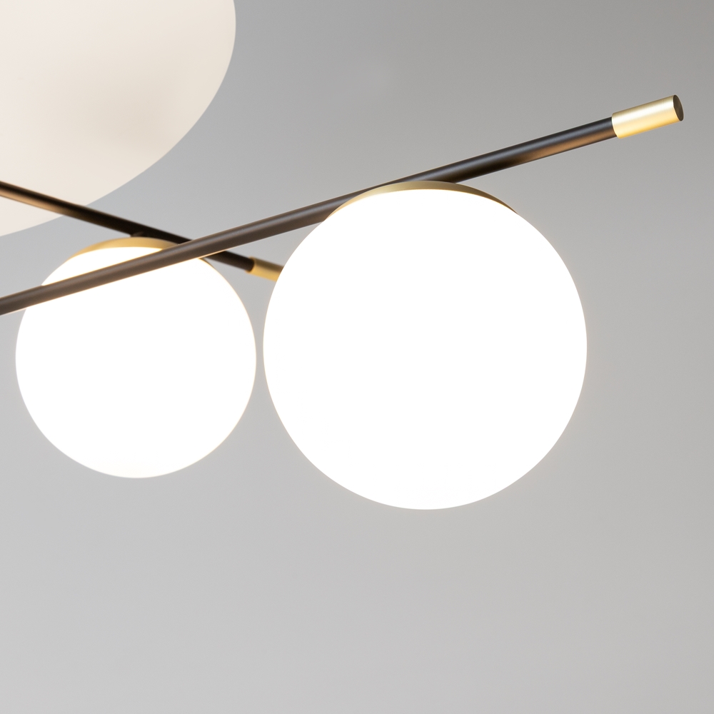 These asymmetrical metal fixtures with opal glass globe shades bring refined elegance and grace to modern interiors. The smooth lines and delicate forms create an atmosphere of sophisticated comfort. The classic pairing of matte gold and white offers a harmonious balance that fits effortlessly into both minimalist and traditional settings.