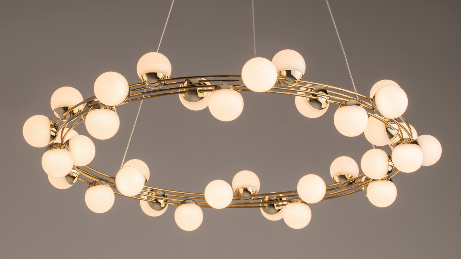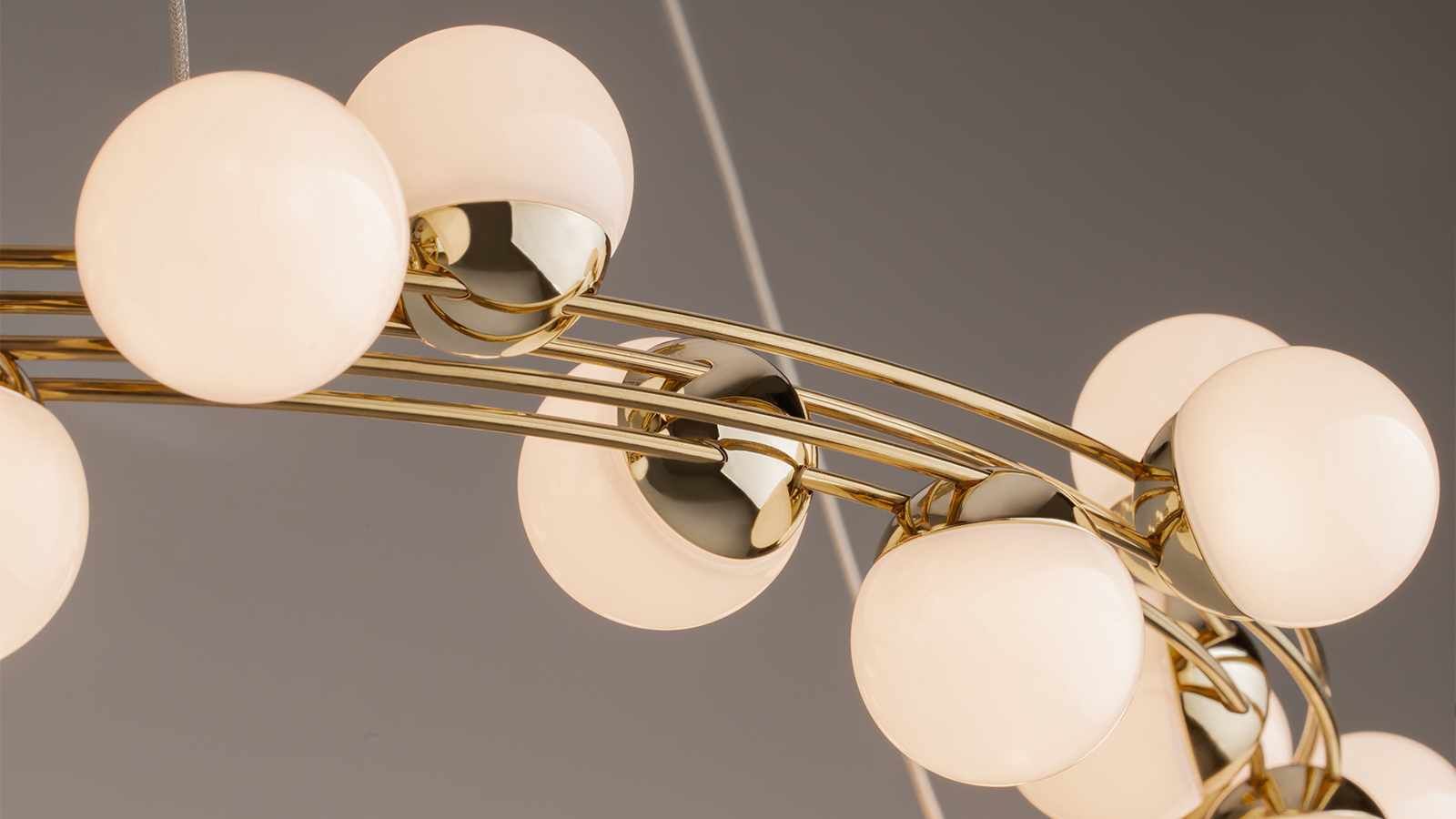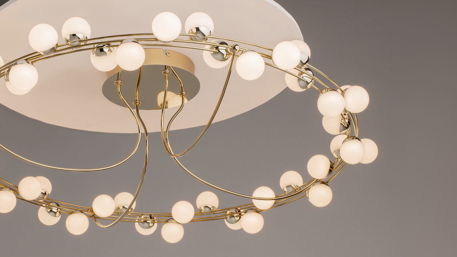 The wide circular frame adorned with “molecular” light elements delivers bright, even illumination while filling the space with a sense of comfort. The design, inspired by the natural structure of atoms, remains timeless and versatile, creating bold accents in any interior.