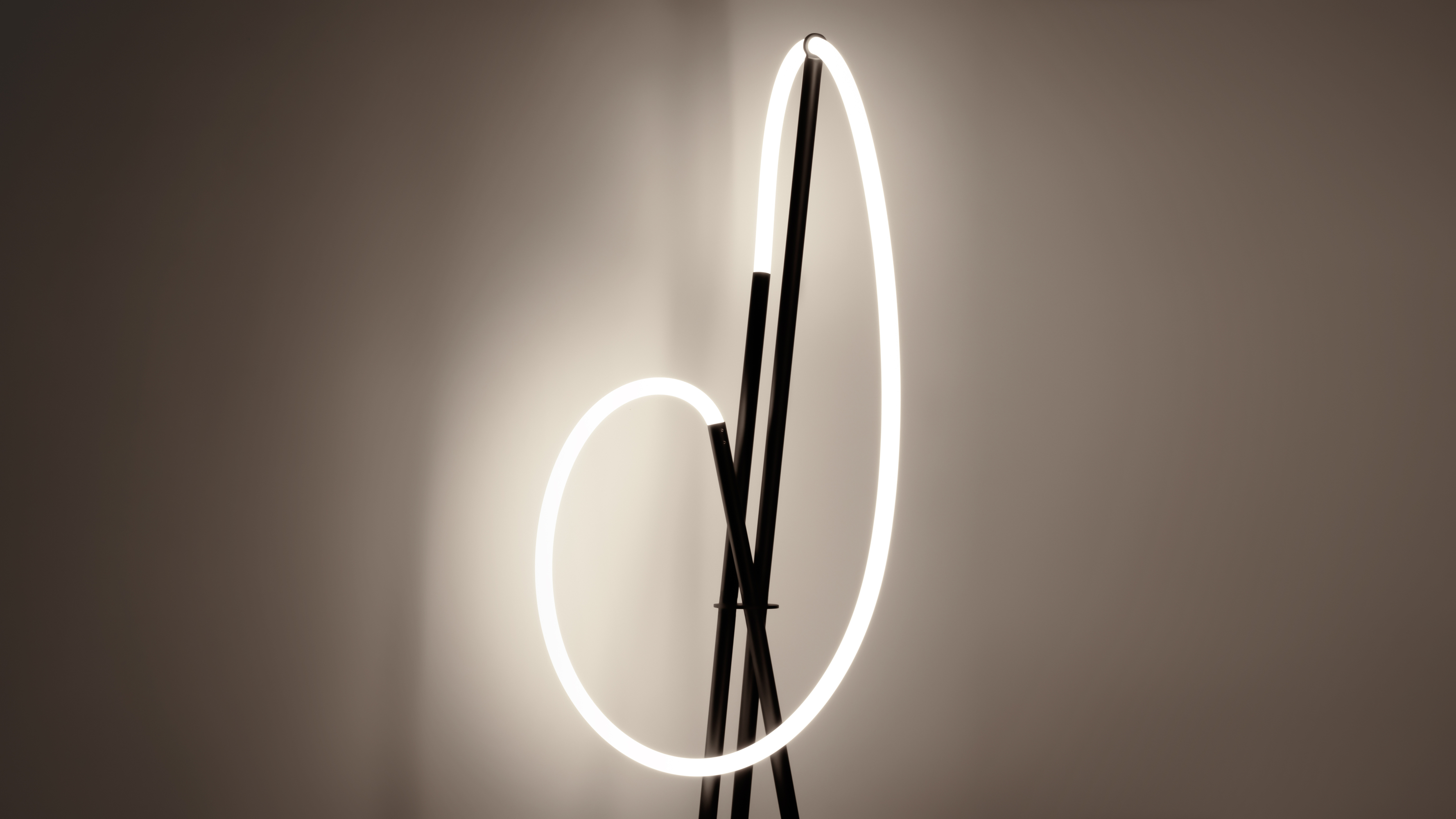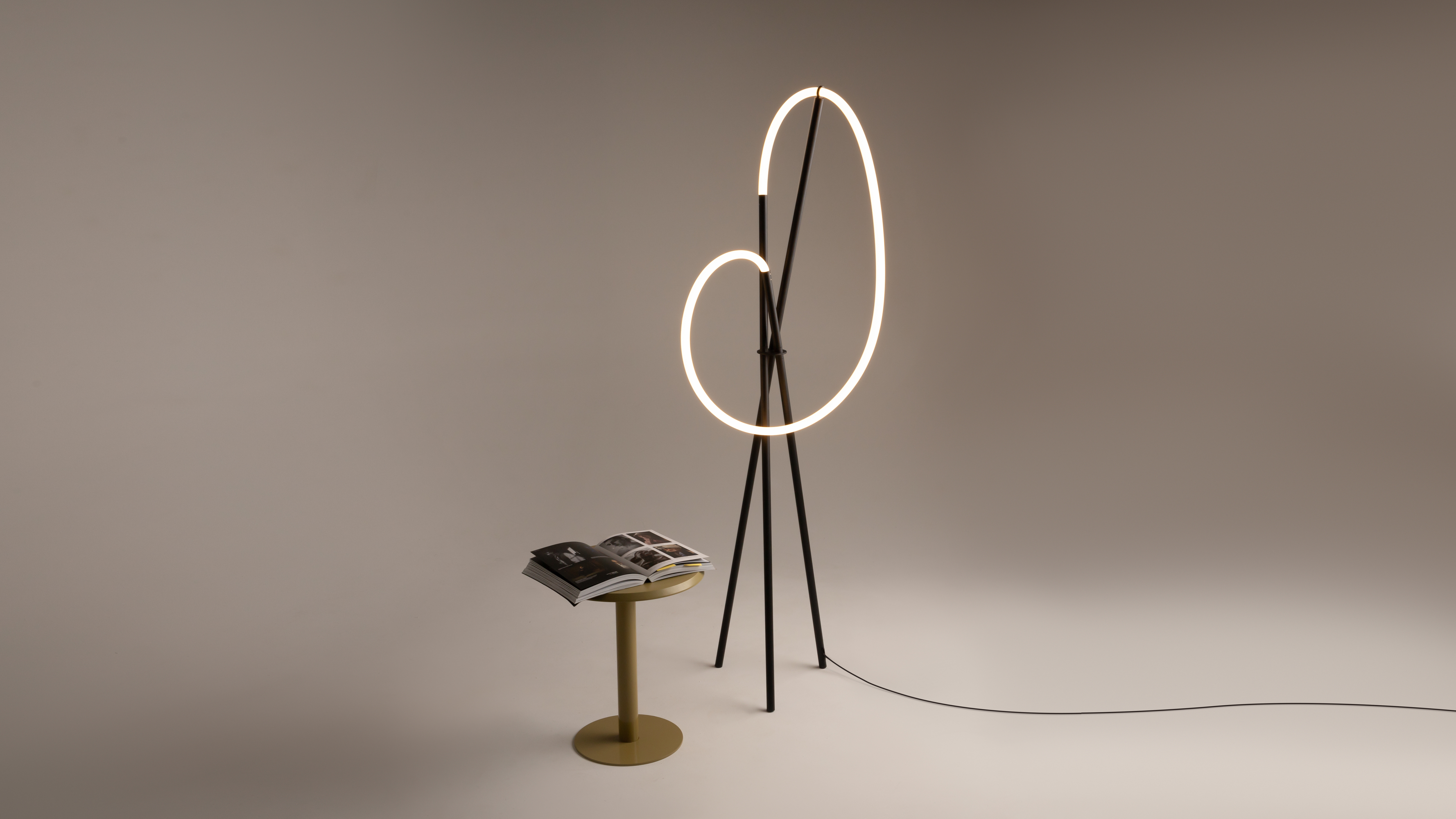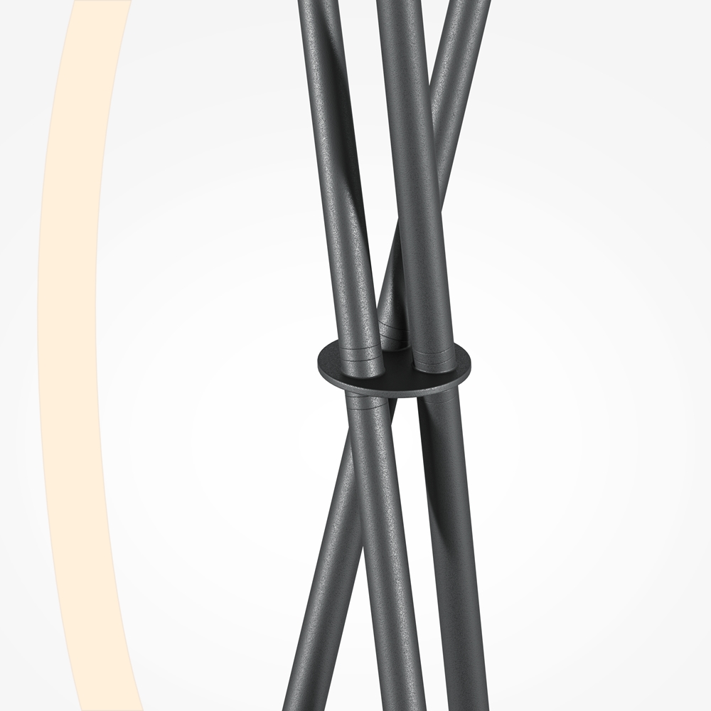 The metal frame of the floor lamp, resembling the interwoven structure of knitting needles, is paired with a flexible silicone diffuser, whose loops mimic the delicate art of crochet. This unique visual composition maintains a minimalist aesthetic while delivering an innovative approach to lighting design.