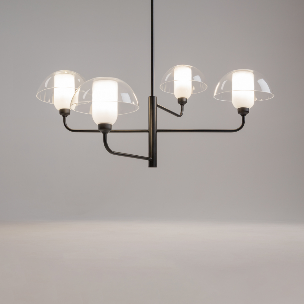 The combination of an internal semi-transparent white glass reflector and an outer transparent glass lampshade provides a soft, bright glow with a graceful glare, creating a relaxed and balanced feeling. The design provides easy access to the main light source and prevents the contamination of the matte reflector's inside. Replaceable bulbs provide for individual selection of wattage and color temperature.