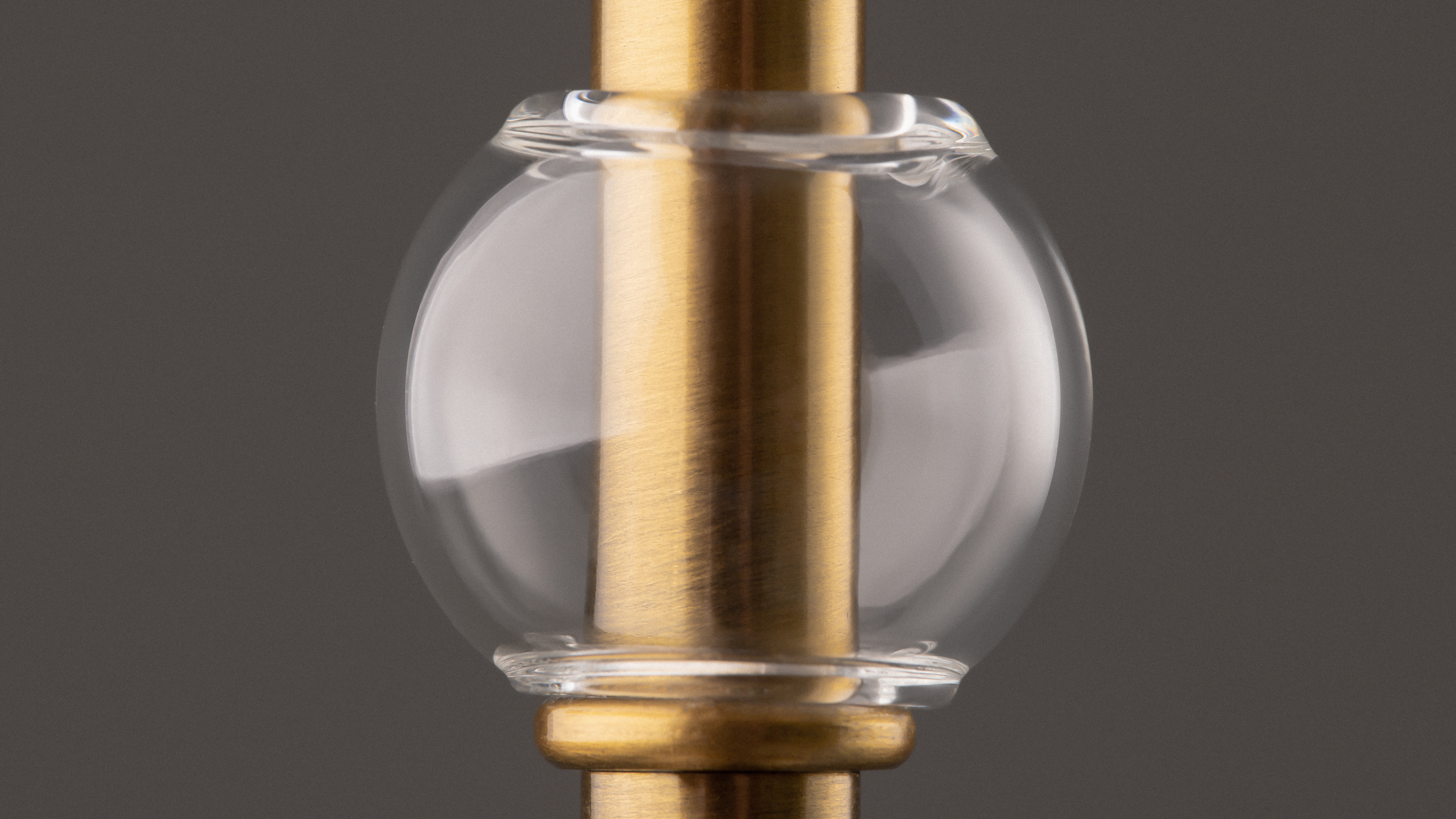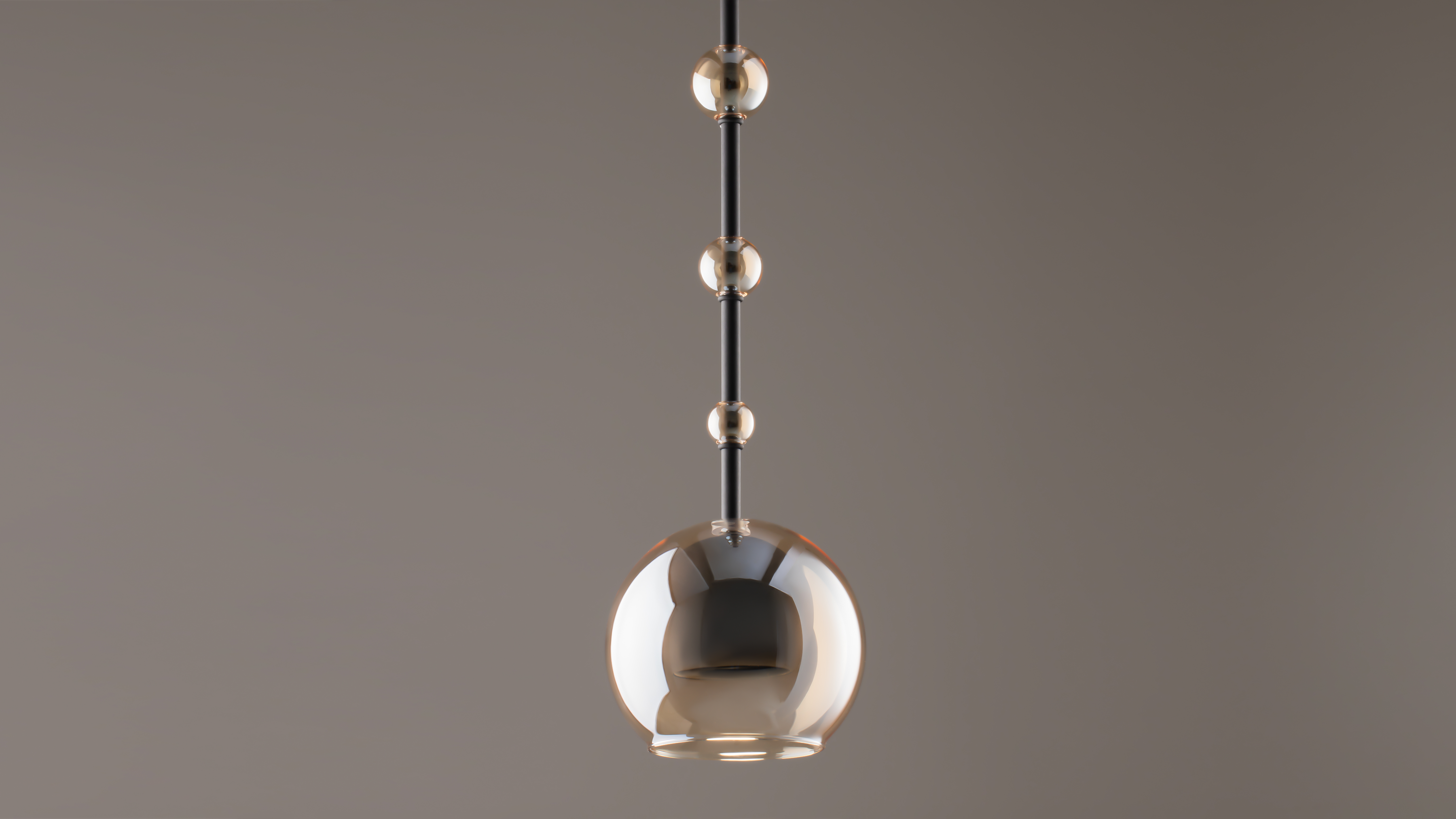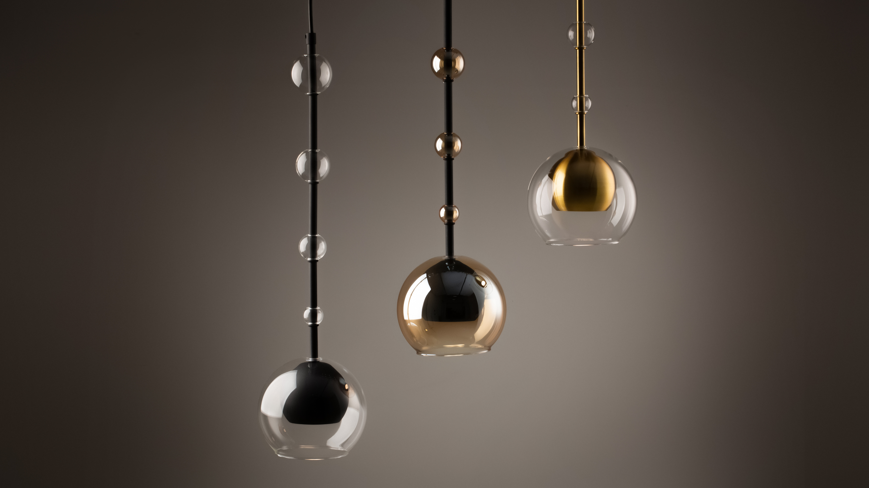 Ros is the Latin word for dew. This natural phenomenon inspired the design of the eponymous series. Like drops of water, the diffusers and decorative elements made of blown glass reflect the colors and details of the surrounding world. Monochrome fittings bring the dewdrop light sources together into concisely designed lamps, making it easy to create compositions. The length of the wires can be adjusted up to 3000 mm. Available in 3 color combinations: black with clear glass, clear glass with brass, and amber glass with black. Mixing and matching is possible.