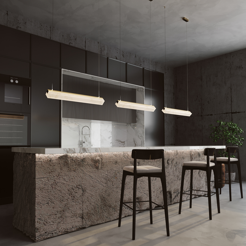 So far, the Petra series comprises a single, yet quite remarkable, horizontal pendant luminaire that can become a unique accent in your interior. The natural stone (alabaster) bar with a marble pattern is seamlessly incorporated into a rhombic shape and secured with brass-colored fittings. The luminaire will look spectacular above your kitchen table or bar, as well as in your living room. The LED light source with a color temperature of 3000K illuminates the stone from within. The height is adjustable, and the maximum wire length is 3 meters, making it suitable for use in rooms with high ceilings.