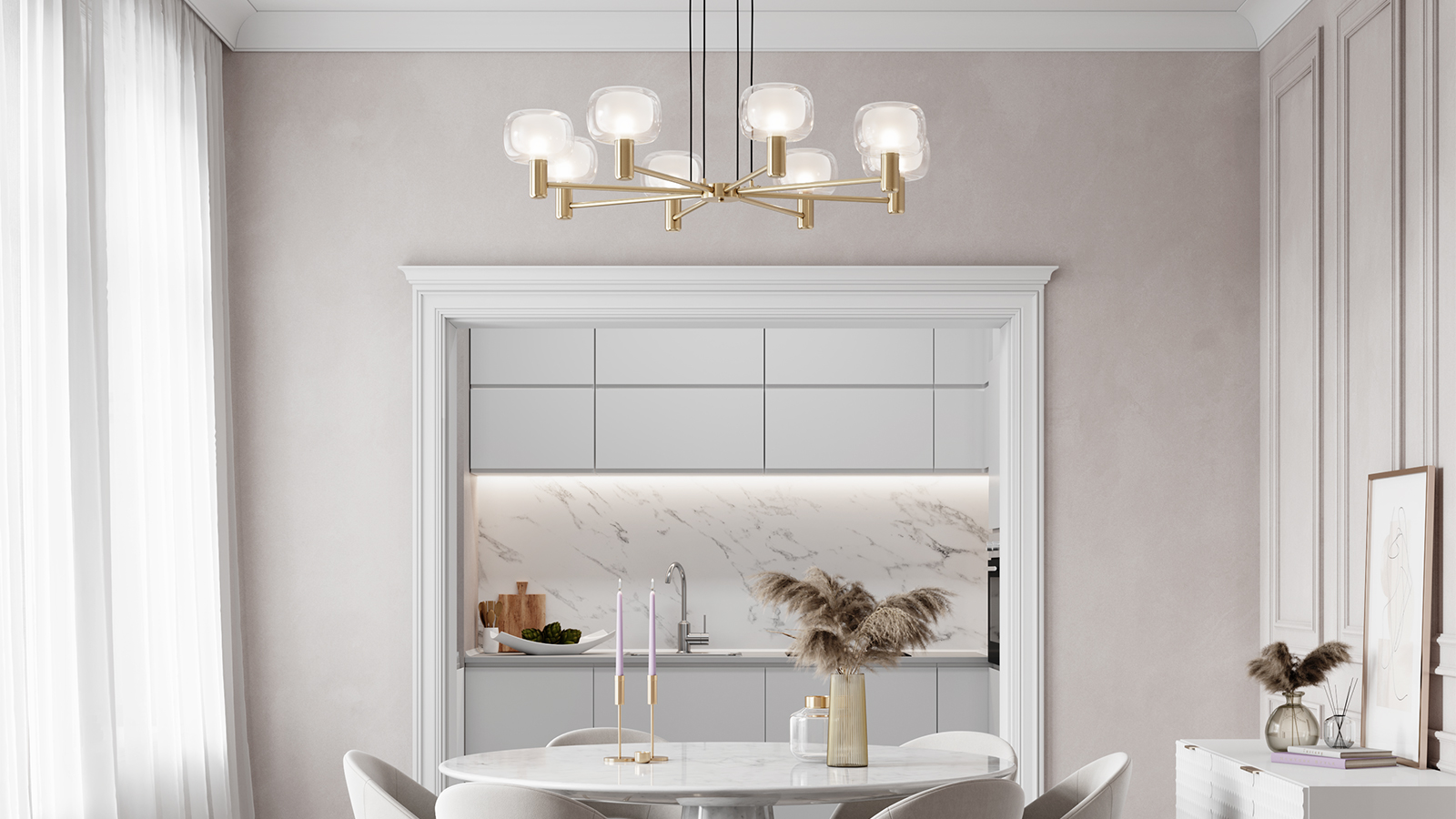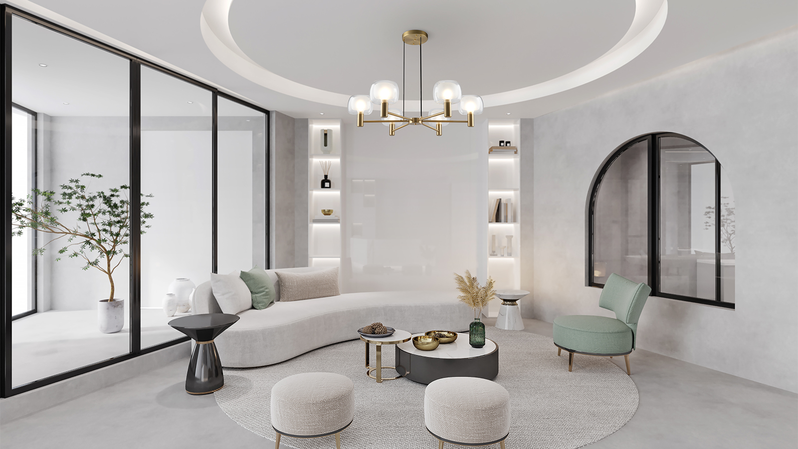 Minimalist, fluid lines of glass and metal define the collection’s visual language.