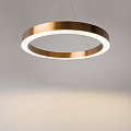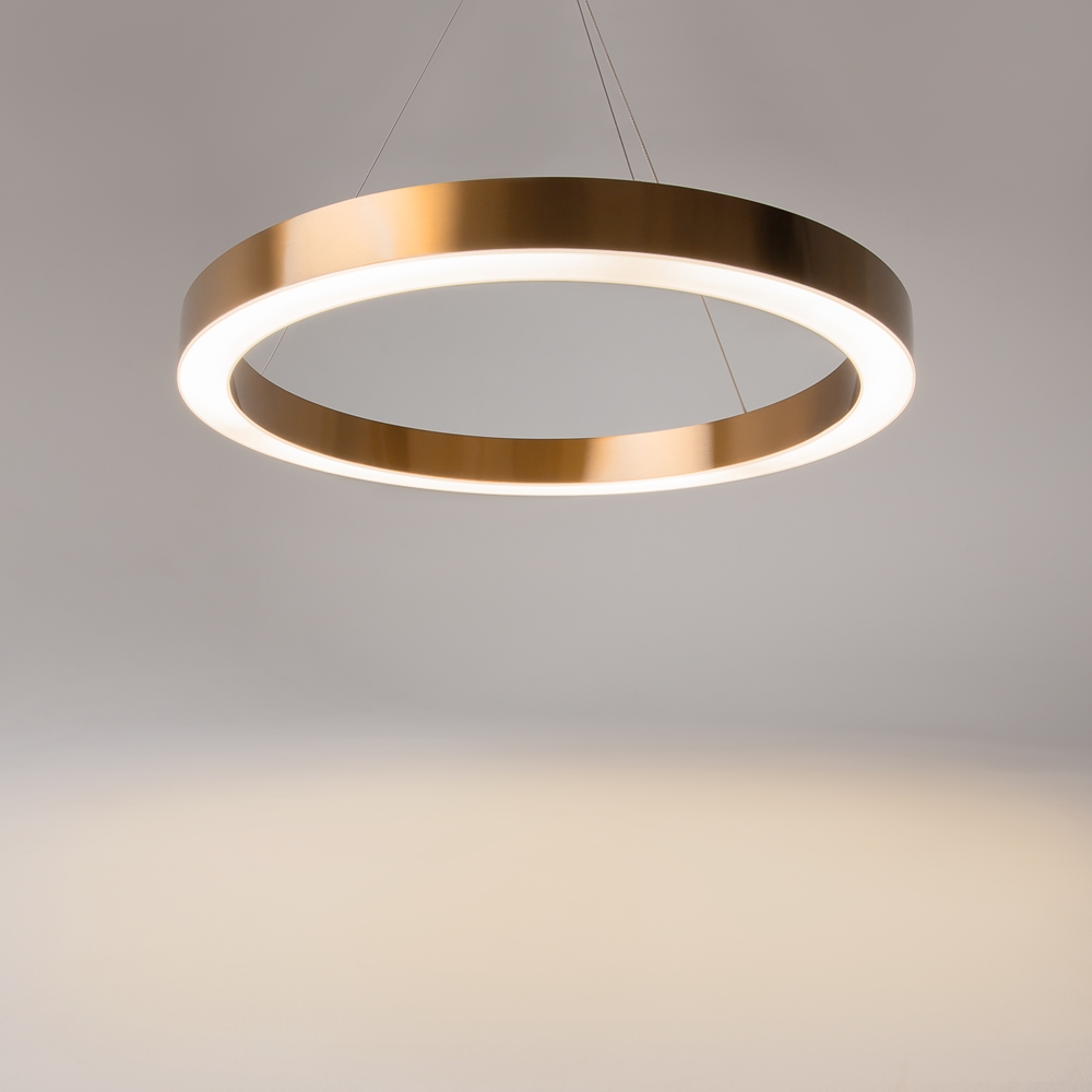 The frame is made of stainless steel with a brass color. The integrated LED light source delivers a color temperature of 3,500K. The collection features a signature circular design and includes pendant models in various diameters.