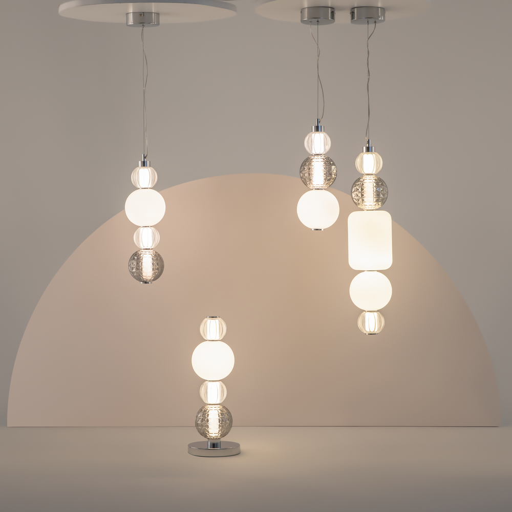 The Collar collection is designed for those who appreciate distinctive, high-end aesthetics. Each luminaire features a combination of glass elements strung along a suspension cable, presented in three variations: cast clear glass with vertical patterning, blown matte glass, and stamped tinted glass with geometric motifs. The integrated LED strip, housed within an acrylic diffuser, ensures soft, even light distribution. The collection includes pendants in three sizes, as well as a matching table lamp. The height of the pendants can be easily adjusted by altering the length of the cable, allowing multiple Collar models to be combined into unique and stylish pendant-and-table lamp arrangements.
