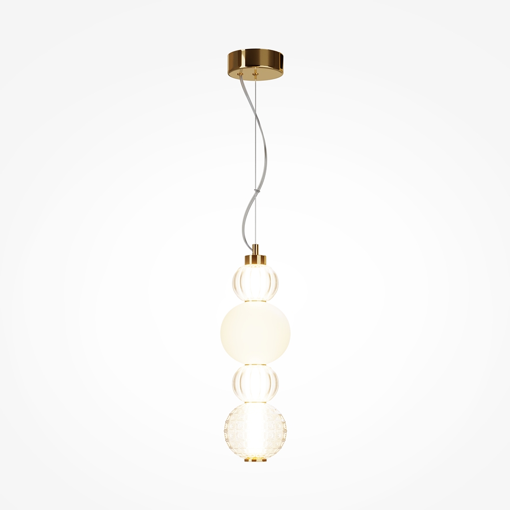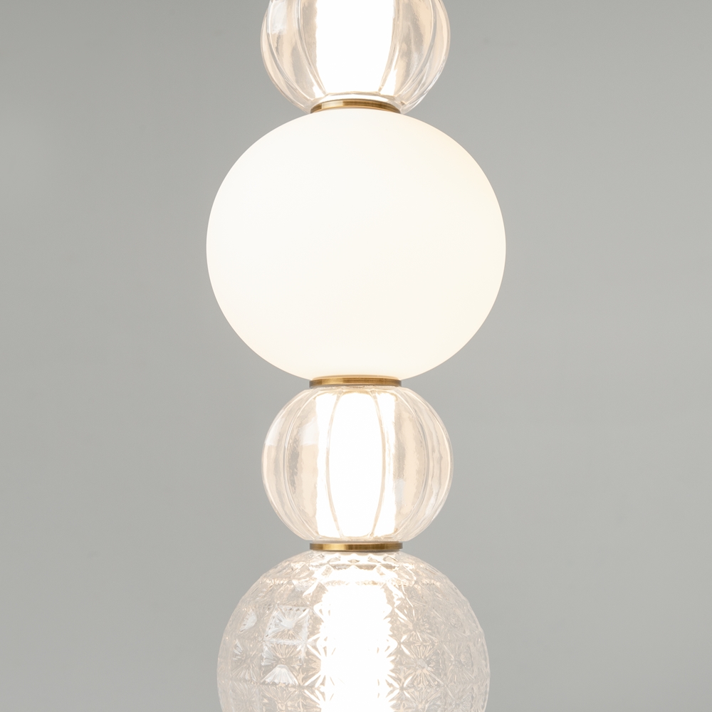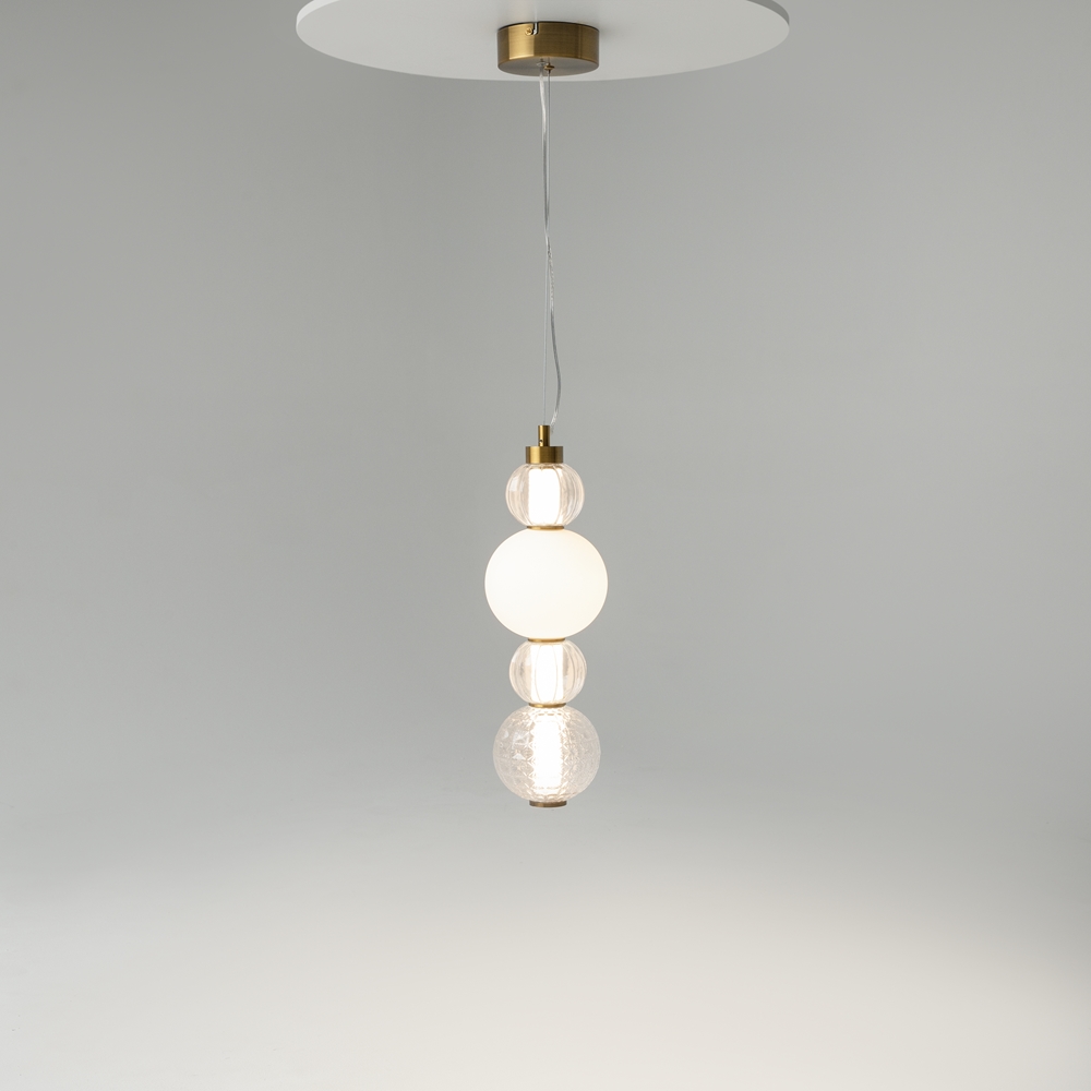 The Collar collection is designed for those who appreciate distinctive, high-end aesthetics. Each luminaire features a combination of glass elements strung along a suspension cable, presented in three variations: cast clear glass with vertical patterning, blown matte glass, and stamped tinted glass with geometric motifs. The integrated LED strip, housed within an acrylic diffuser, ensures soft, even light distribution. The collection includes pendants in three sizes, as well as a matching table lamp. The height of the pendants can be easily adjusted by altering the length of the cable, allowing multiple Collar models to be combined into unique and stylish pendant-and-table lamp arrangements.