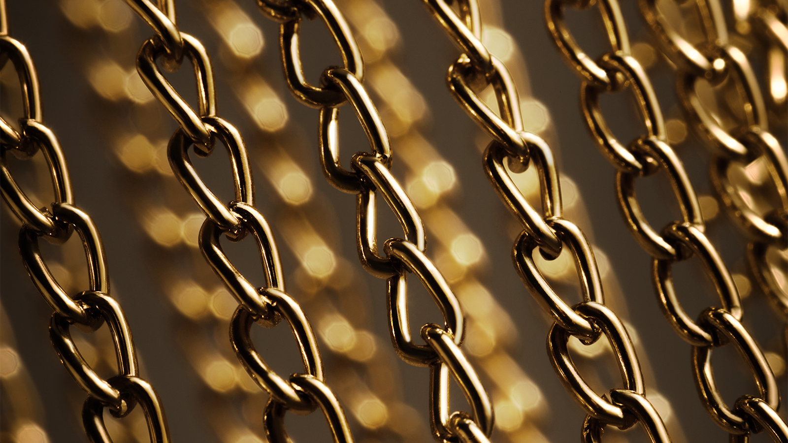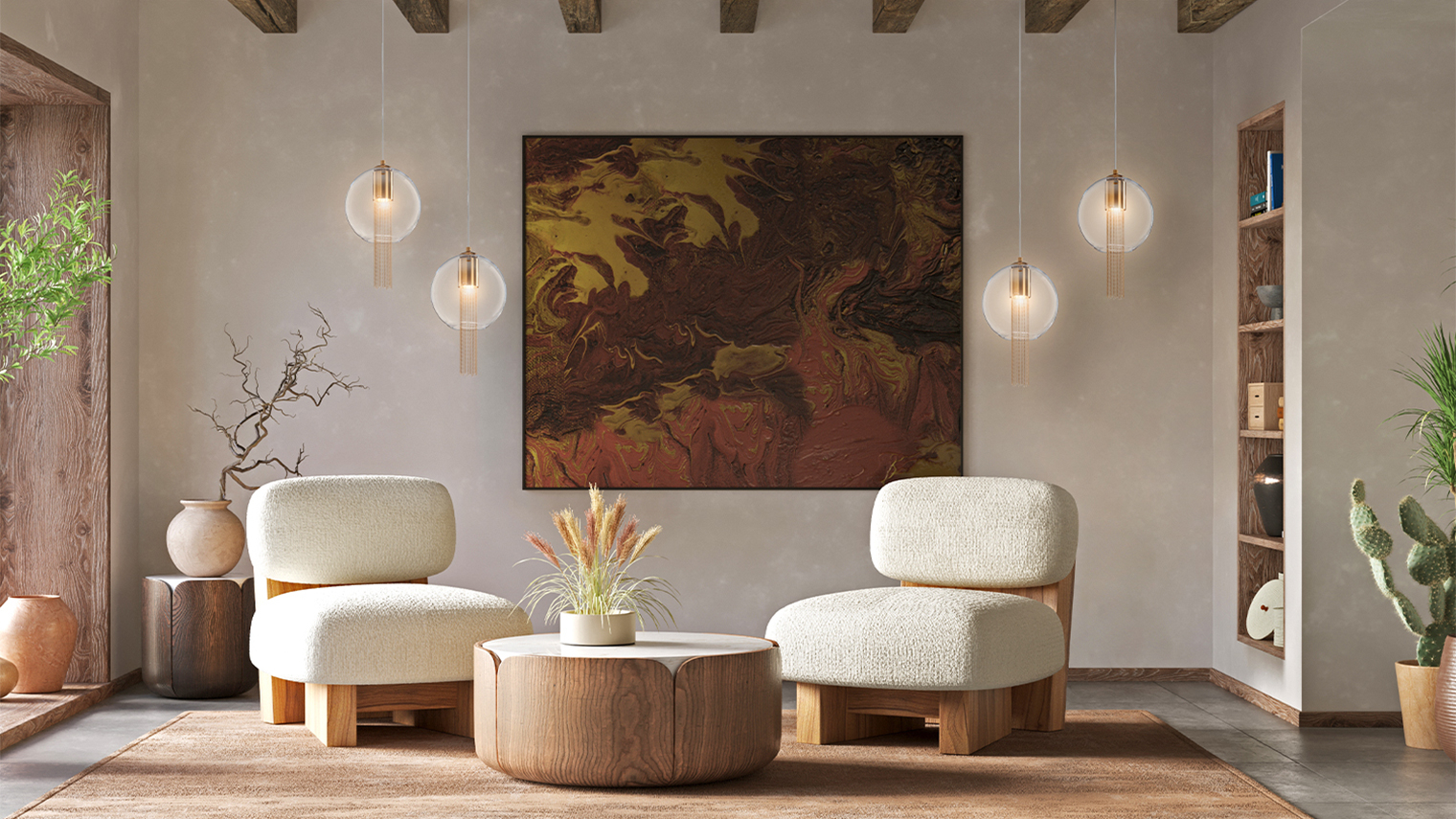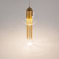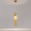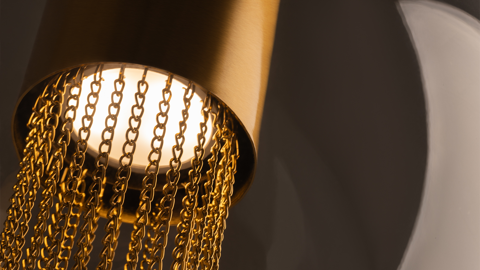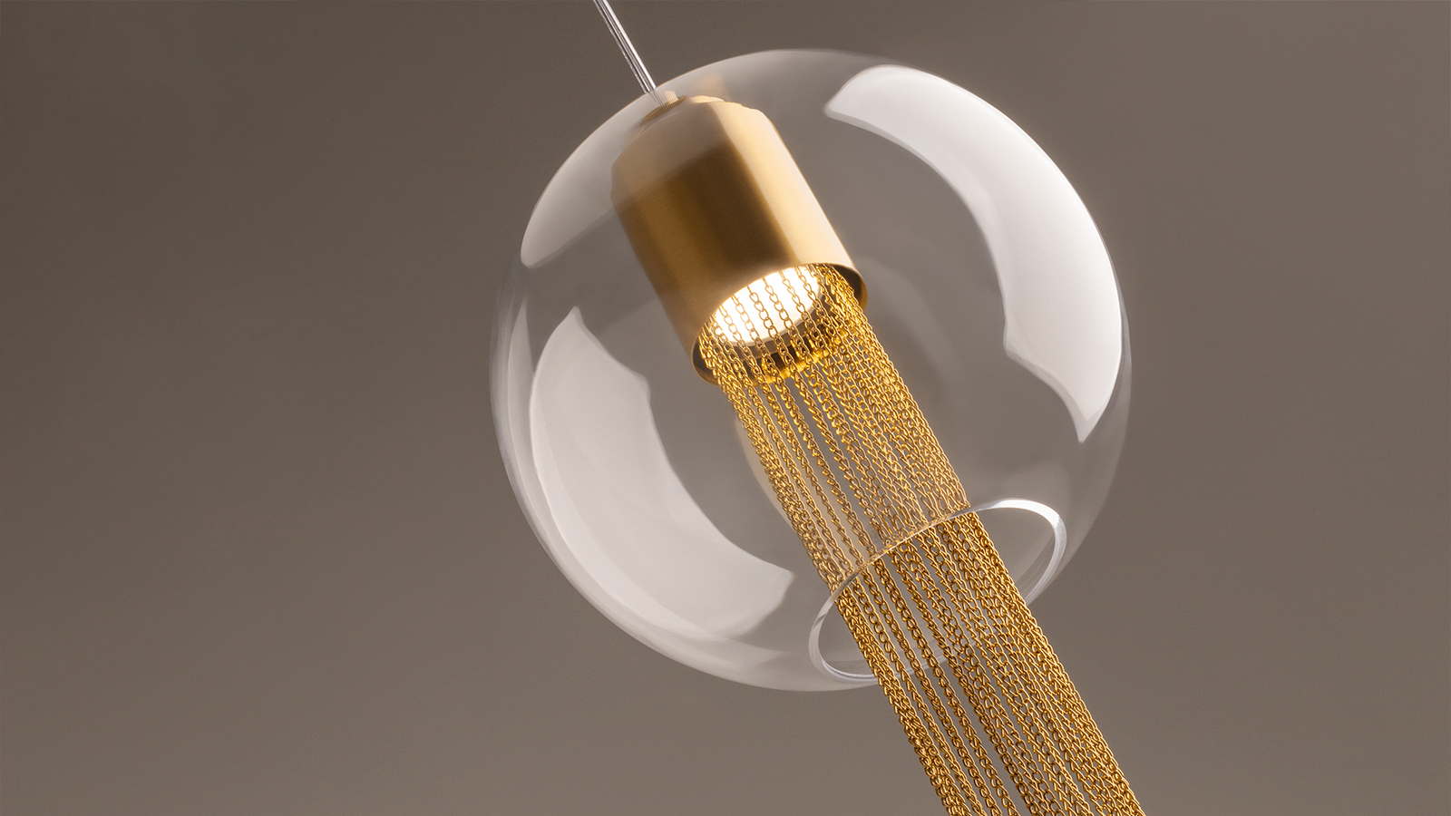 The combination of a transparent glass ball and graceful bronze-colored descending decorative chains creates a feeling of a weightless, elegant and sophisticated jewelry piece. The replaceable bulb is recessed into the bronze-colored metal base, emitting a soft light. The lampshades are available in two diameters for creating compositions.