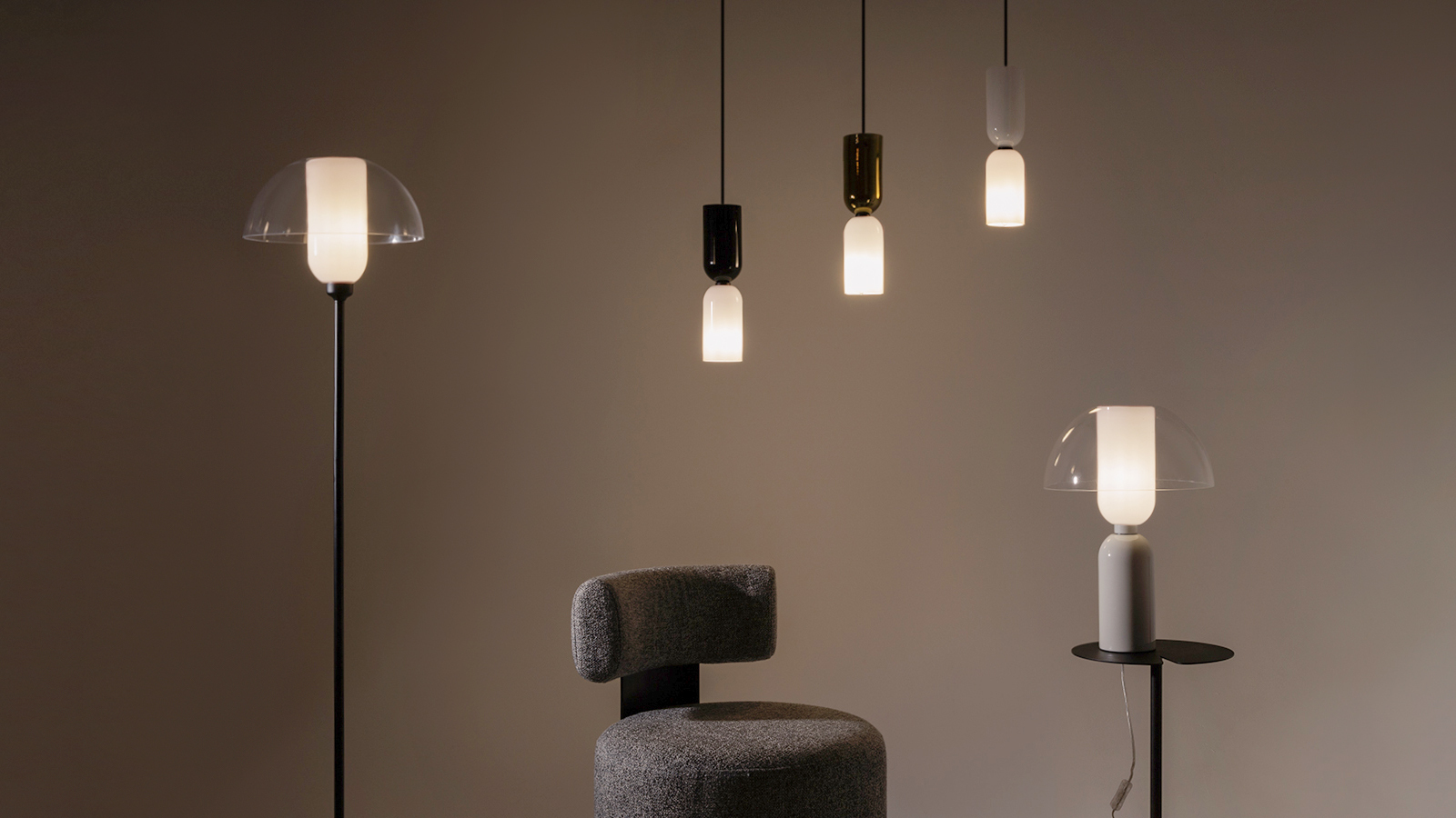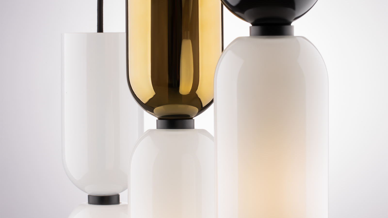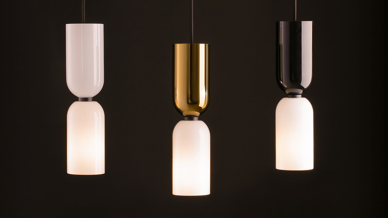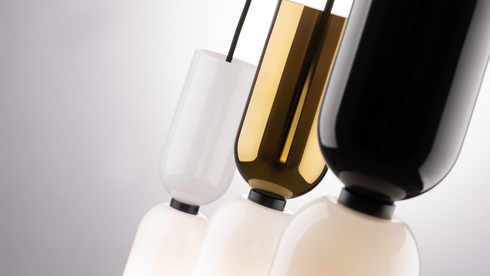 This wide series allows you to combine luminaires with a common shape and different color schemes: glossy black, glossy gold and white. A variety of mounting options is available to create both symmetrical and asymmetrical compositions. All single pendant luminaires feature black wires and ceiling bowls for better compatibility.