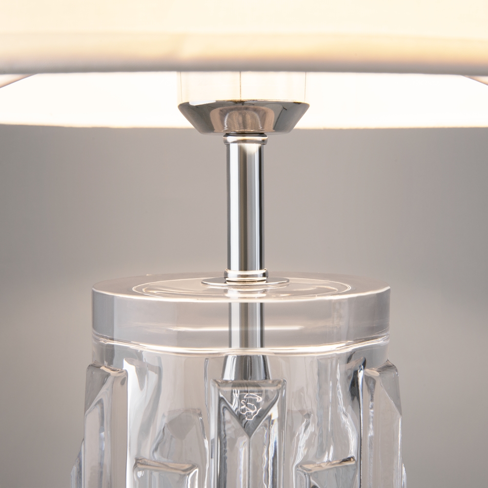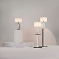 This series of elegant table luminaires, tellingly named Muse, inspires with its unique design. A sculptured cast glass base makes this luminaire particularly special. Its intricate shape is fully revealed with the light on, raising it to an object of modern art. The base is available in three colors: clear, smoke and powder pink, making the choice easy. A milky cloth lampshade makes the light soft and comfortable, producing a warm, cozy vibe. The lamps use E27 bulbs.