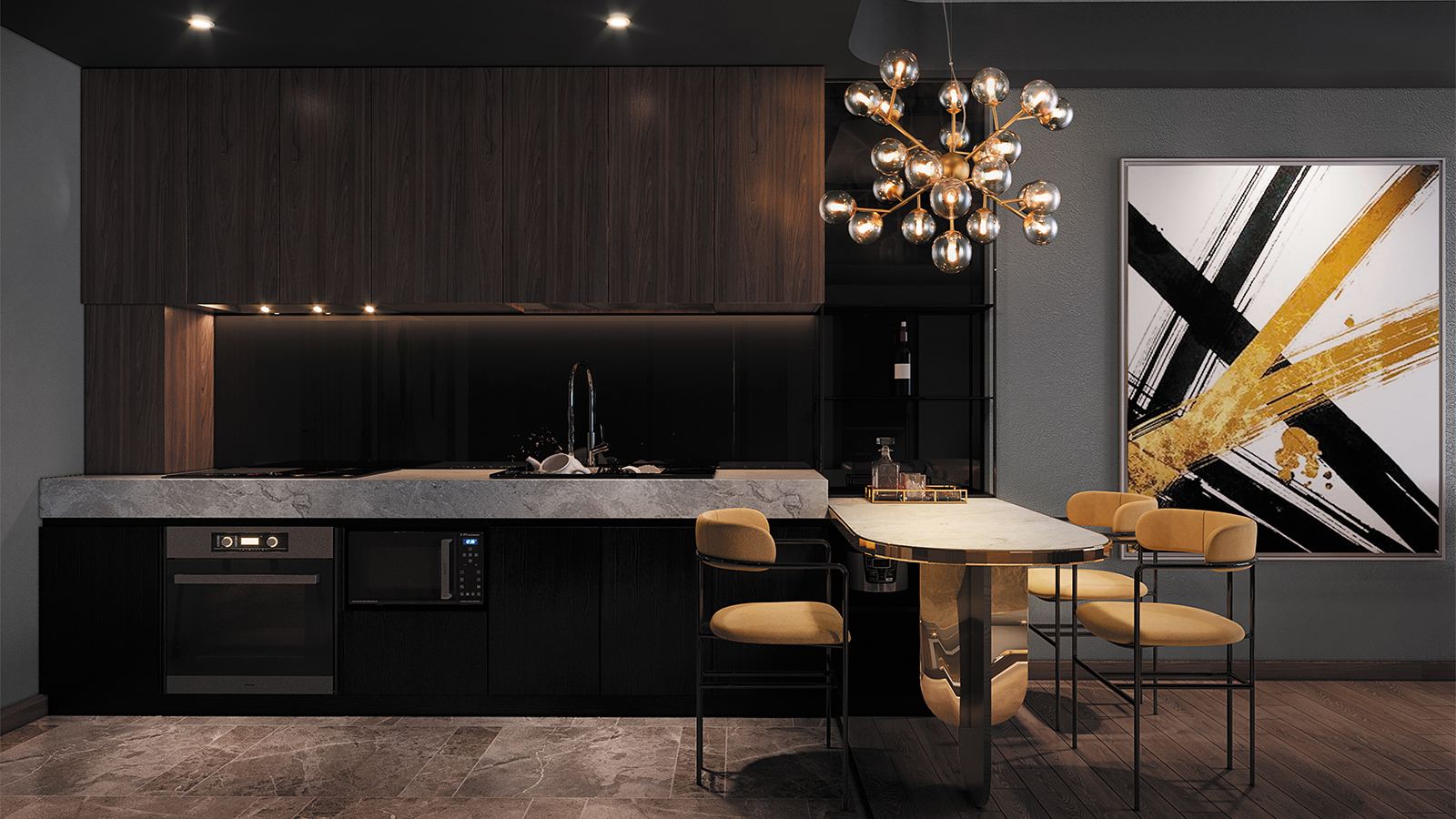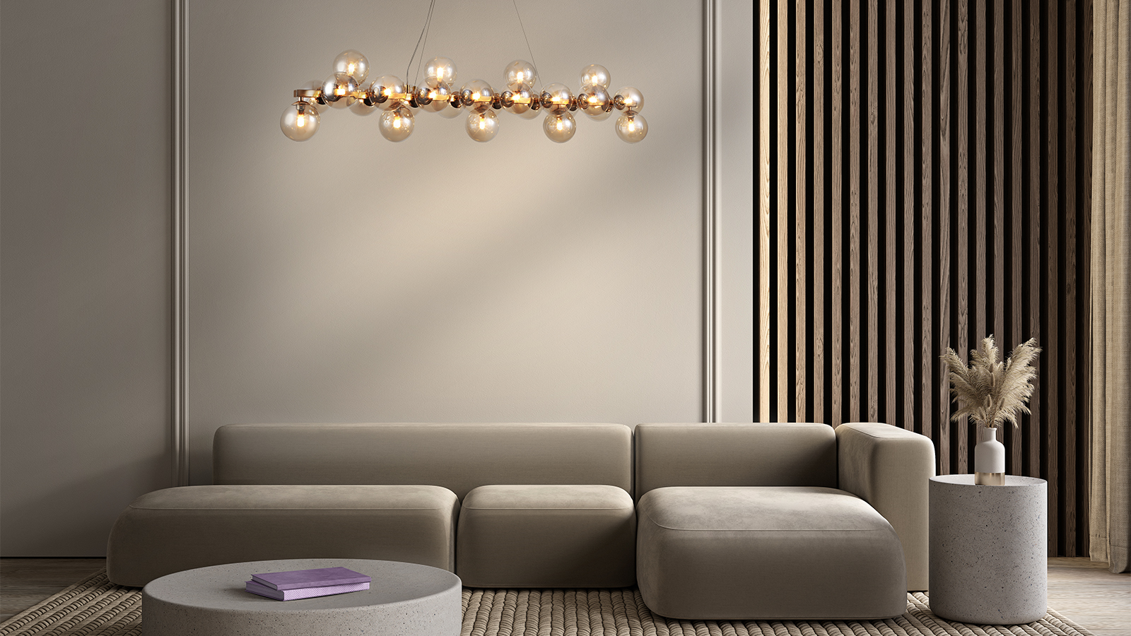 The series showcases large-scale sculptural compositions formed by numerous blown glass spheres. The tinted or clear shades, mounted on polished metal branches, gently diffuse and soften the light, creating a sophisticated visual effect. The luminaires are available in gold, chrome, and brass colors. Suspension height is easily adjustable via the cable length. The series includes ceiling-mounted fixtures, pendants, and wall lamps, offering flexibility for a wide range of interior layouts.