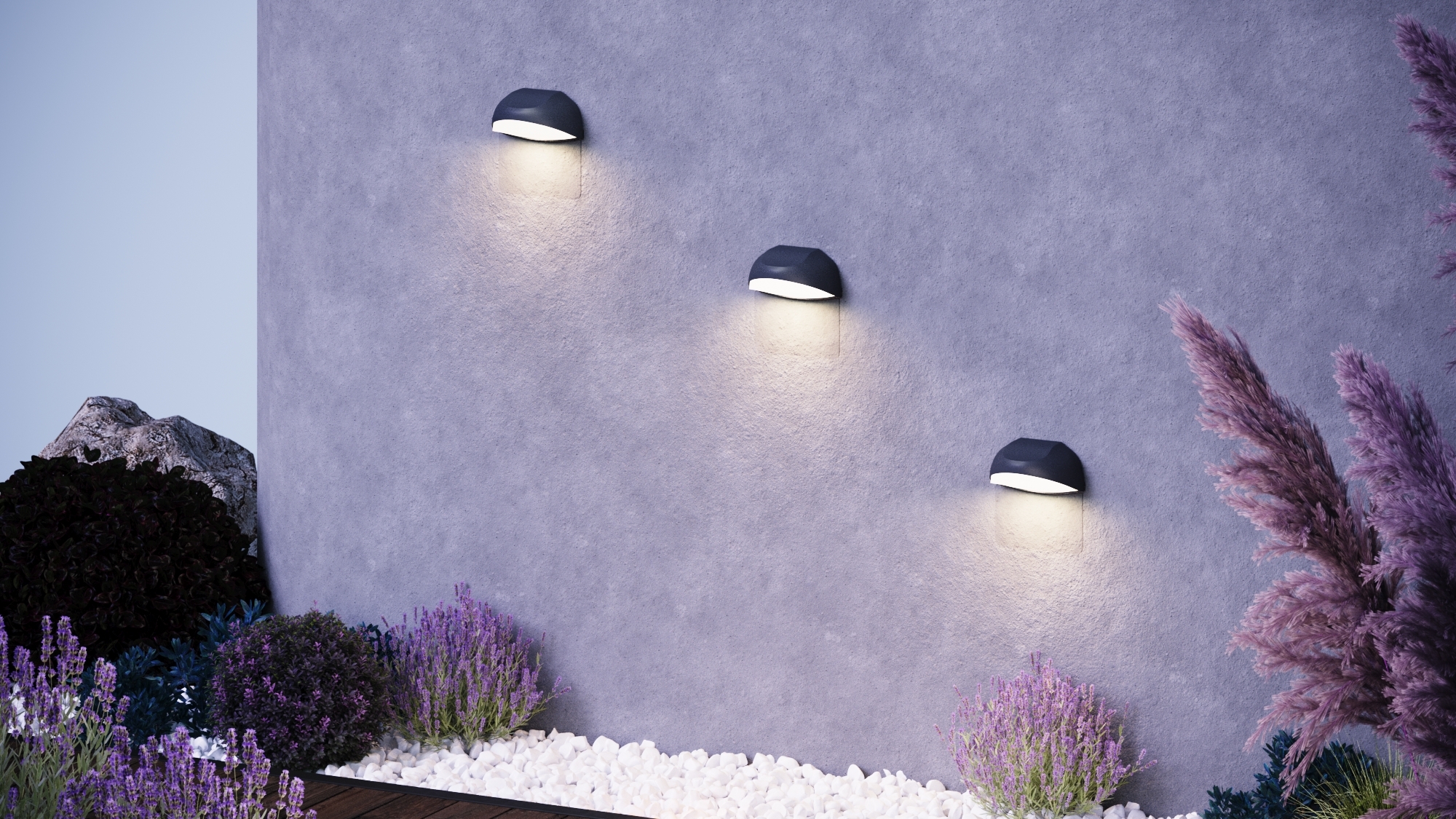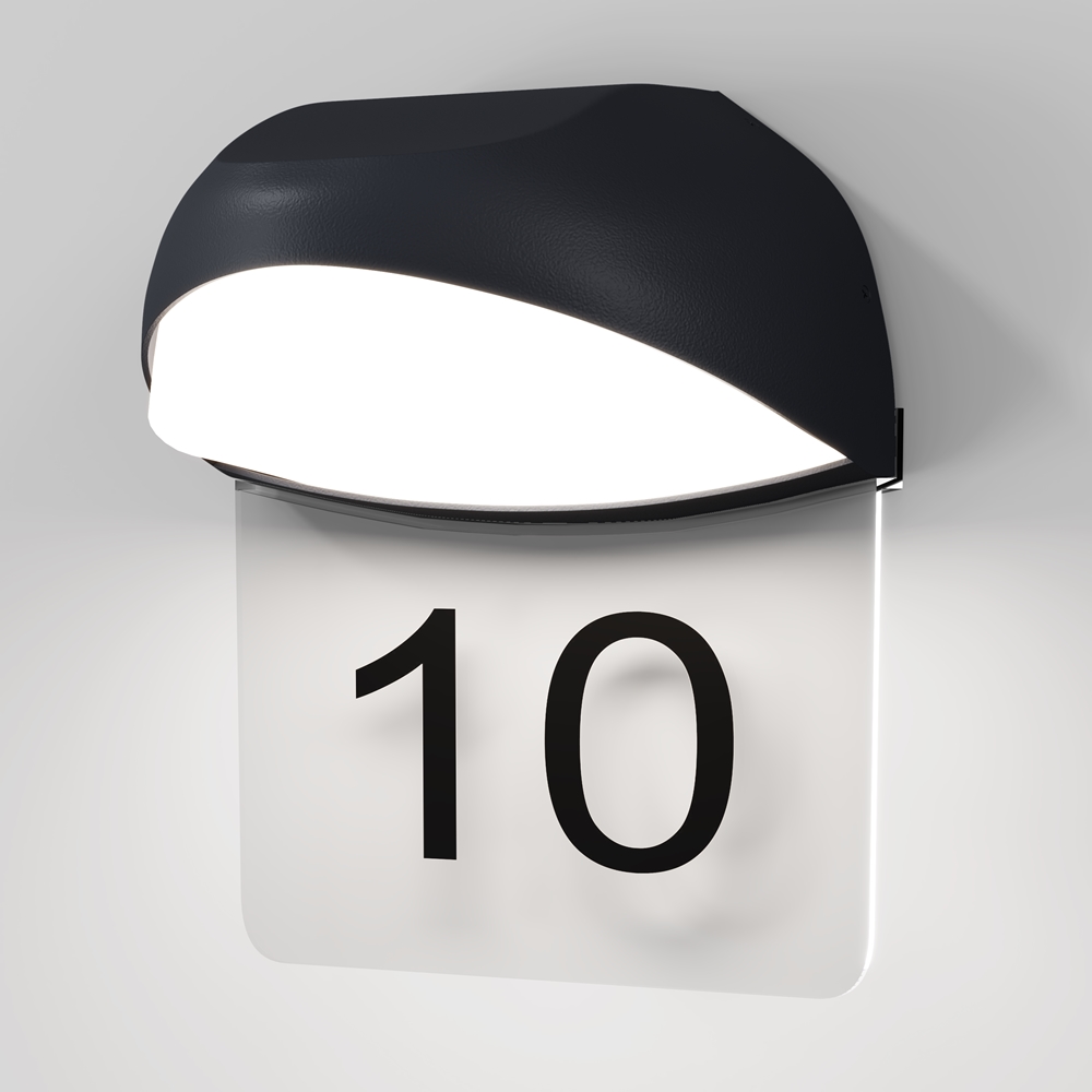 Aluminum body, shade - graphite. Diffuser is made of white matte acrylic. Included is a plate made of transparent plastic for marking (house numbers, etc.). LED light source, color temperature - 3000K. Protection Code IP65.