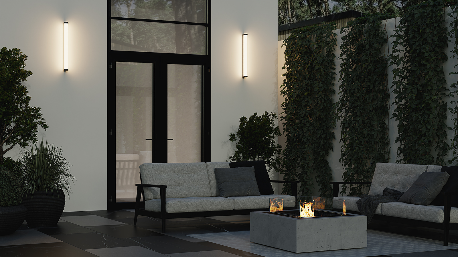 Wall sconces. Featuring a deep black aluminum body, this vertical wallmounted fixture provides bidirectional lighting for a striking architectural effect.