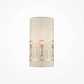 Herraje de metal color de oro. Pantalla: lino natural en PVC. Un ornamento de metal ciñe la pantalla. Dispersor mate.