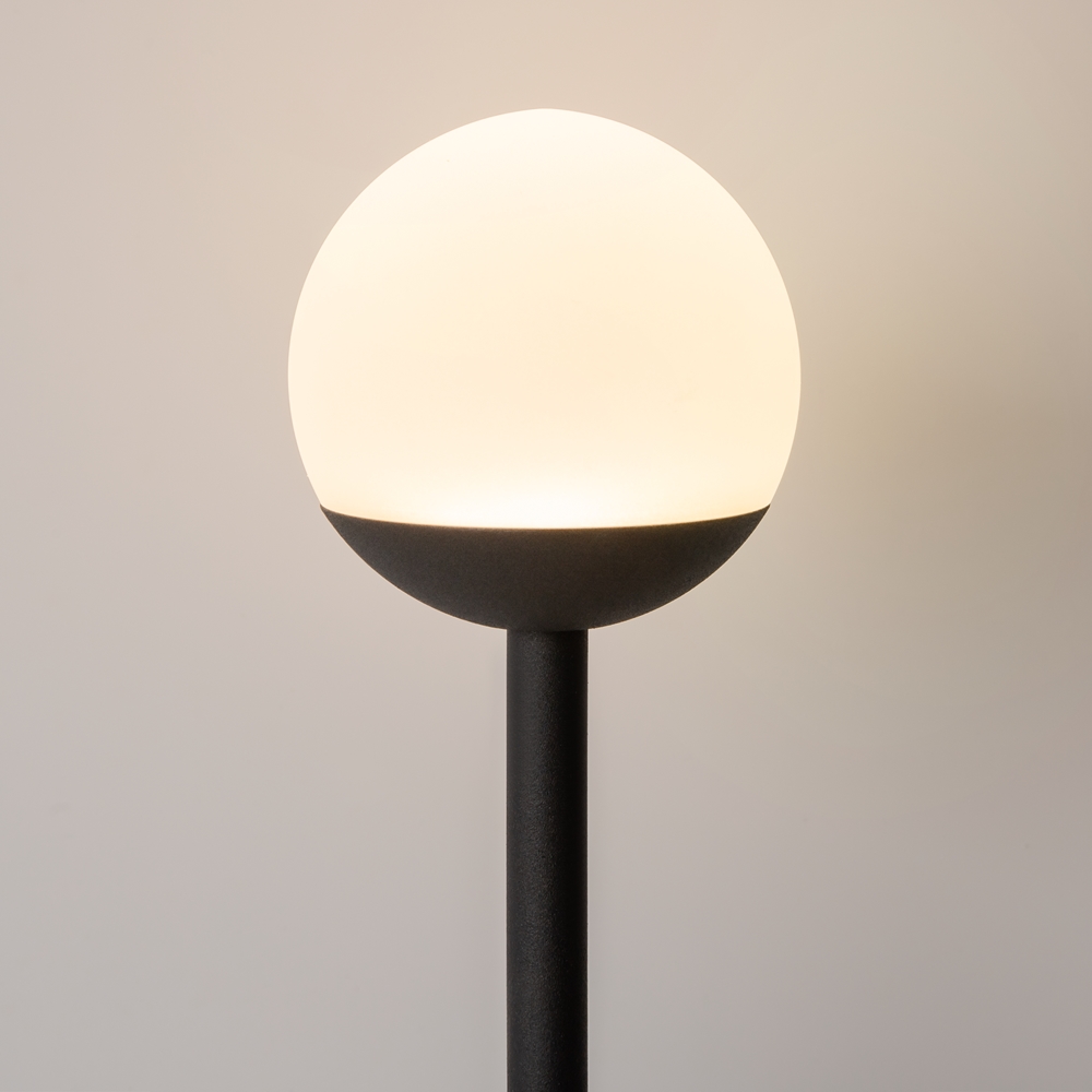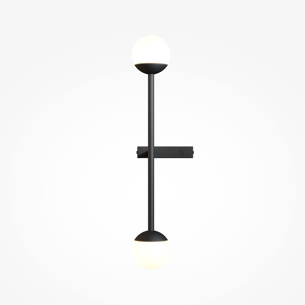 Material del herraje: metal, colores: latón, negro. Plafones esféricos de cristal blanco mate. Fuente de luz LED, temperatura de color: 3000K. El interruptor táctil empotrado ajusta la intensidad de luz en pasos del 25%, 50%, 75% y 100%.