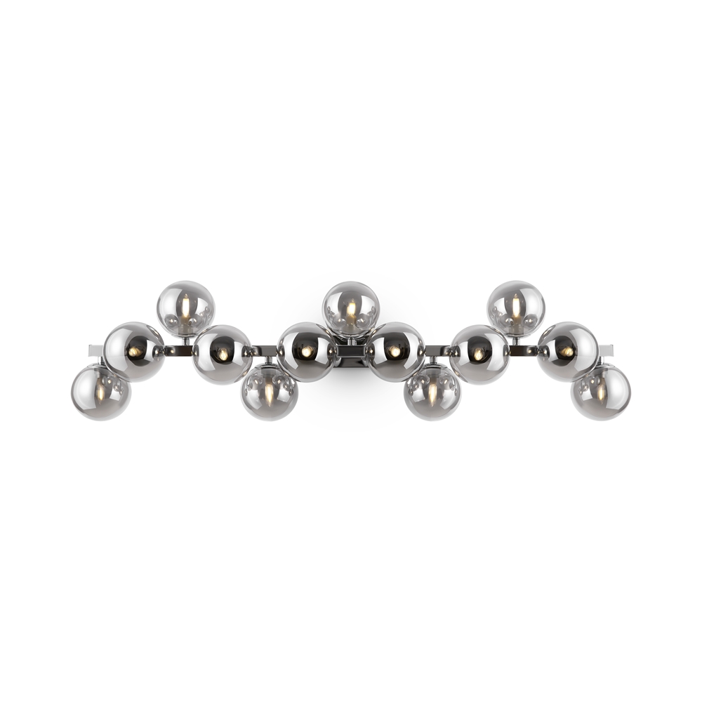 Herraje de metal de 4 colores: negro mate, negro, cromo, oro. Plafones: vidrio soplado. Colores: ahumado, ambarino, coñac, blanco mate y negro. Diseño con imitación de estructura molecular. La altura de las lámparas colgantes se regula con el cable. Bombilla con el casquillo G9.