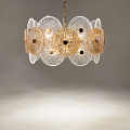 Herraje de metal de color de oro. Decoración esférica de vidrio estriado estampado. Combinación de los matices ambarino y transparente en la decoración. Altura regulable. Fuente de luz: bombillas con el casquillo E14.