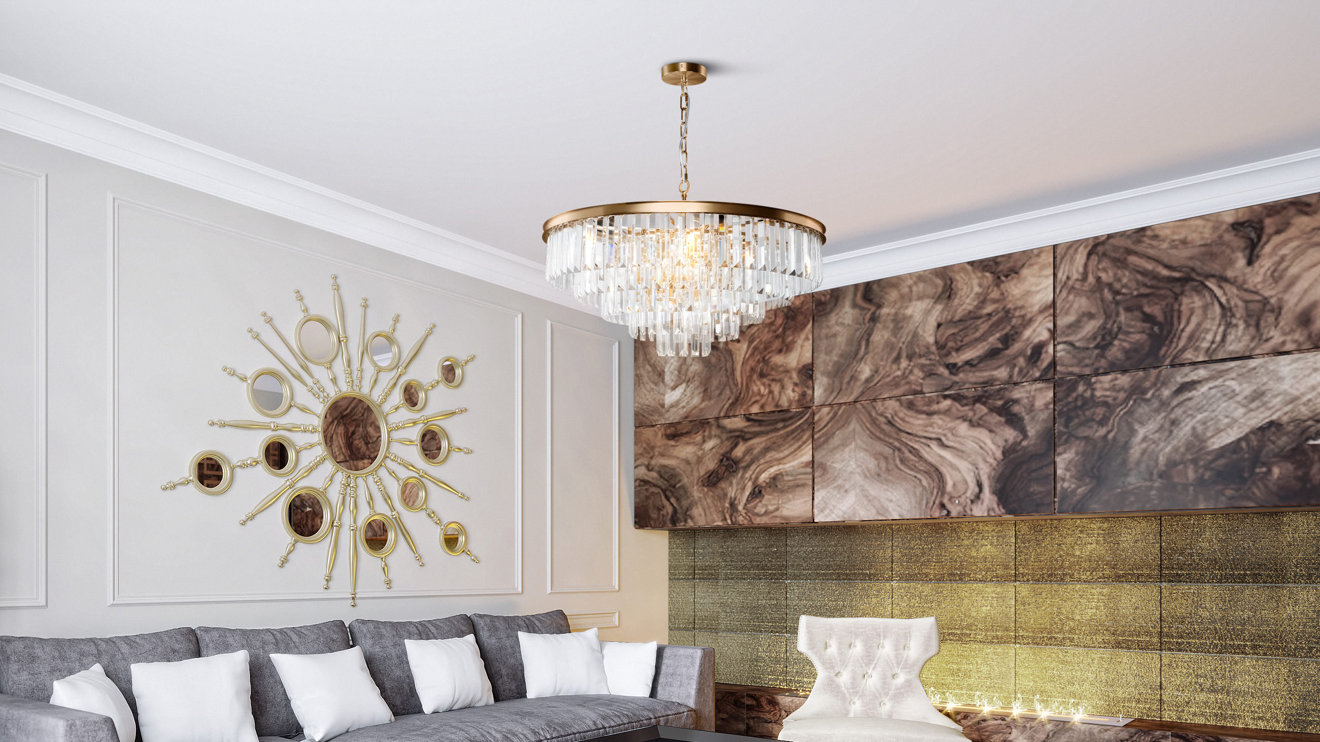 Herraje de metal de dos colores: latón, oro. Decoración de varias capas. Suspensiones: vidrio transparente (herraje color latón) y ambarino (herraje color dorado). La altura de los modelos colgantes se regula.